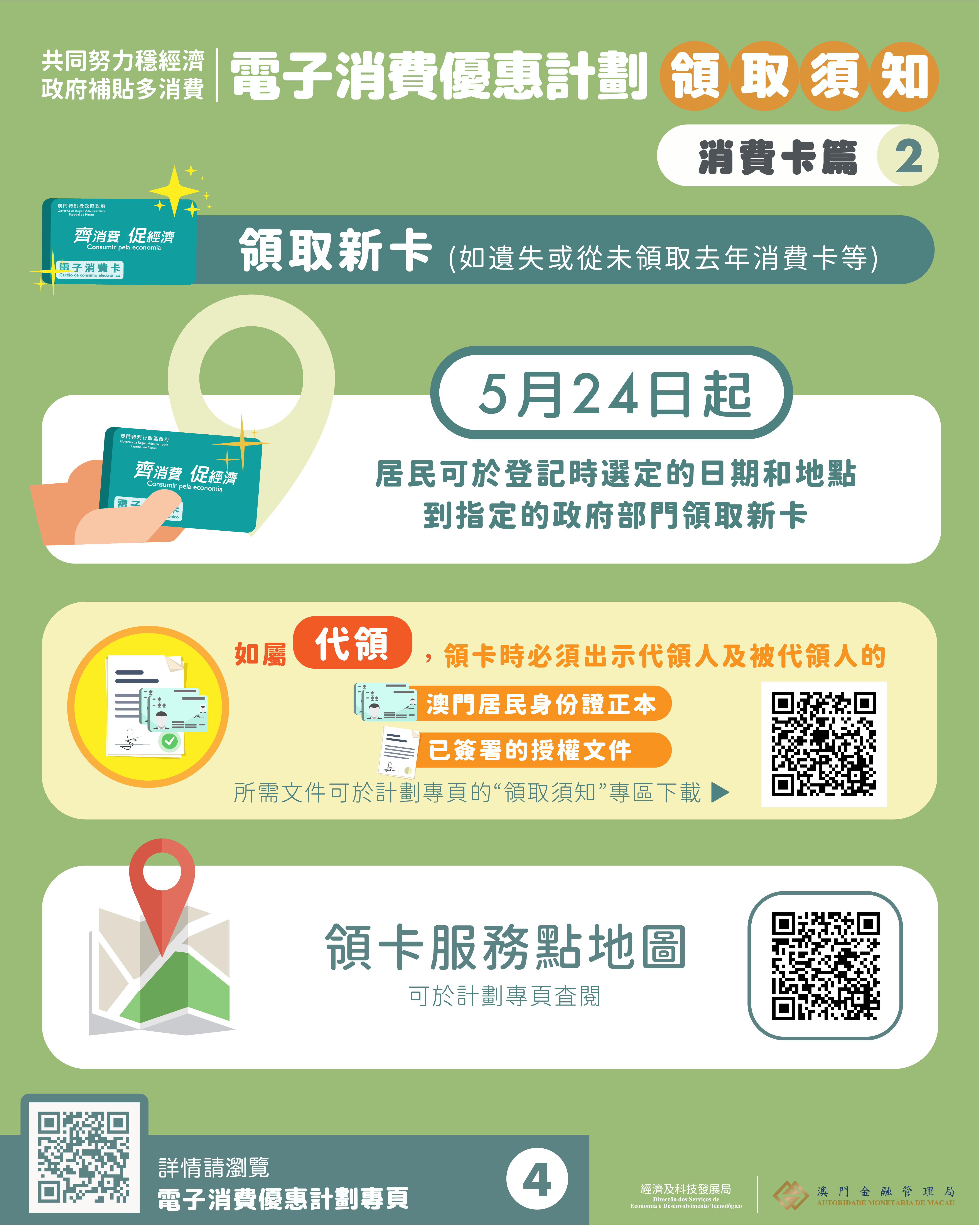 - 如屬代領新卡的情況,領卡時須出示代領人及被代領人的澳門居民身份證正本、聲明書及授權書等文件。相關文件可於計劃專頁的“領取須知”專區查閱及下載(https://www.dsedt.gov.mo/econsumo/zh_TW/pickup_info.jsp#a1)。