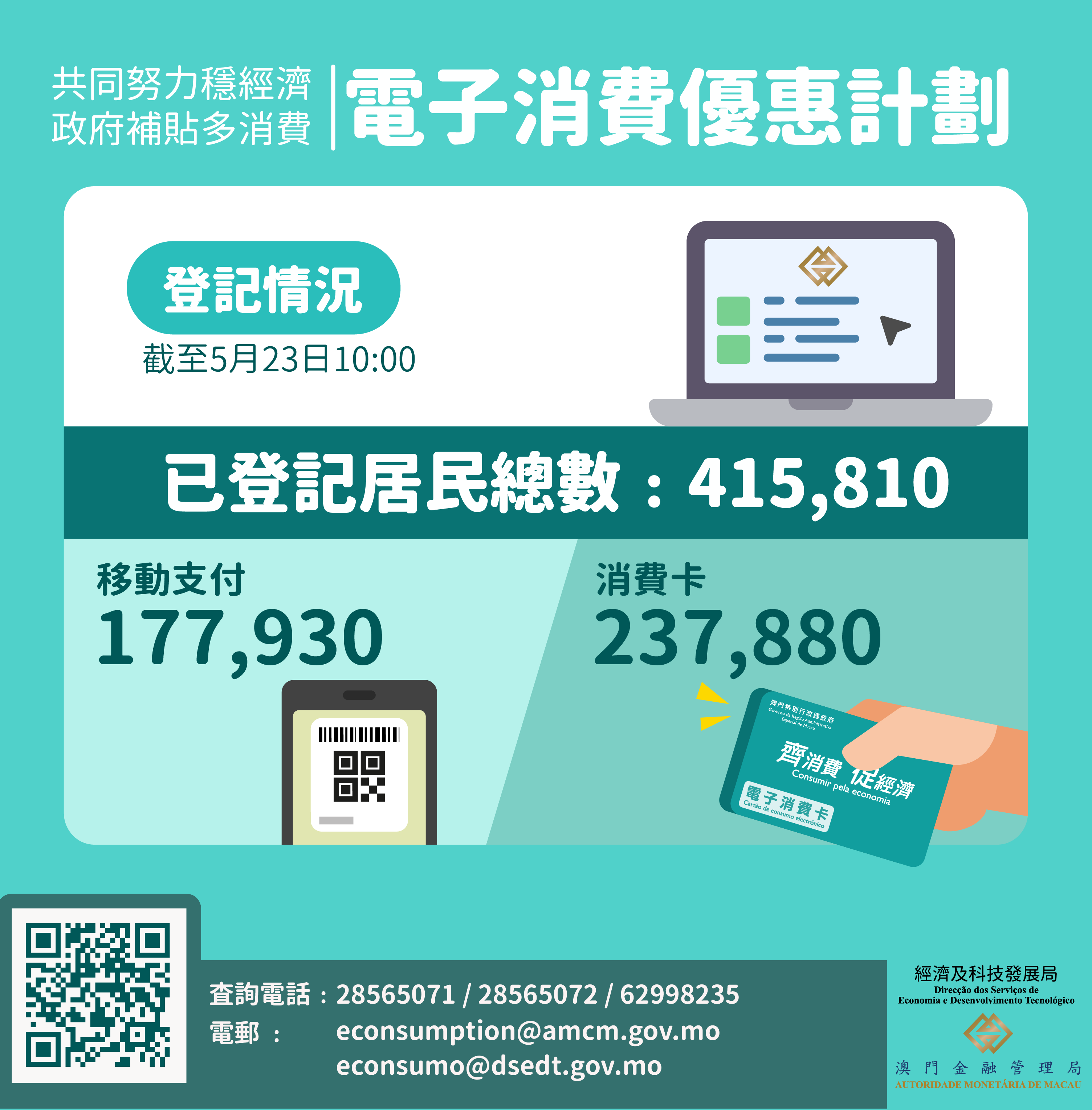 “電子消費優惠計劃”自5月7日起接受網上登記,截至今(23)日上午,已有近41.6萬名居民完成登記,當中約17.8萬人選擇“移動支付”,約23.8萬人選擇“消費卡”。