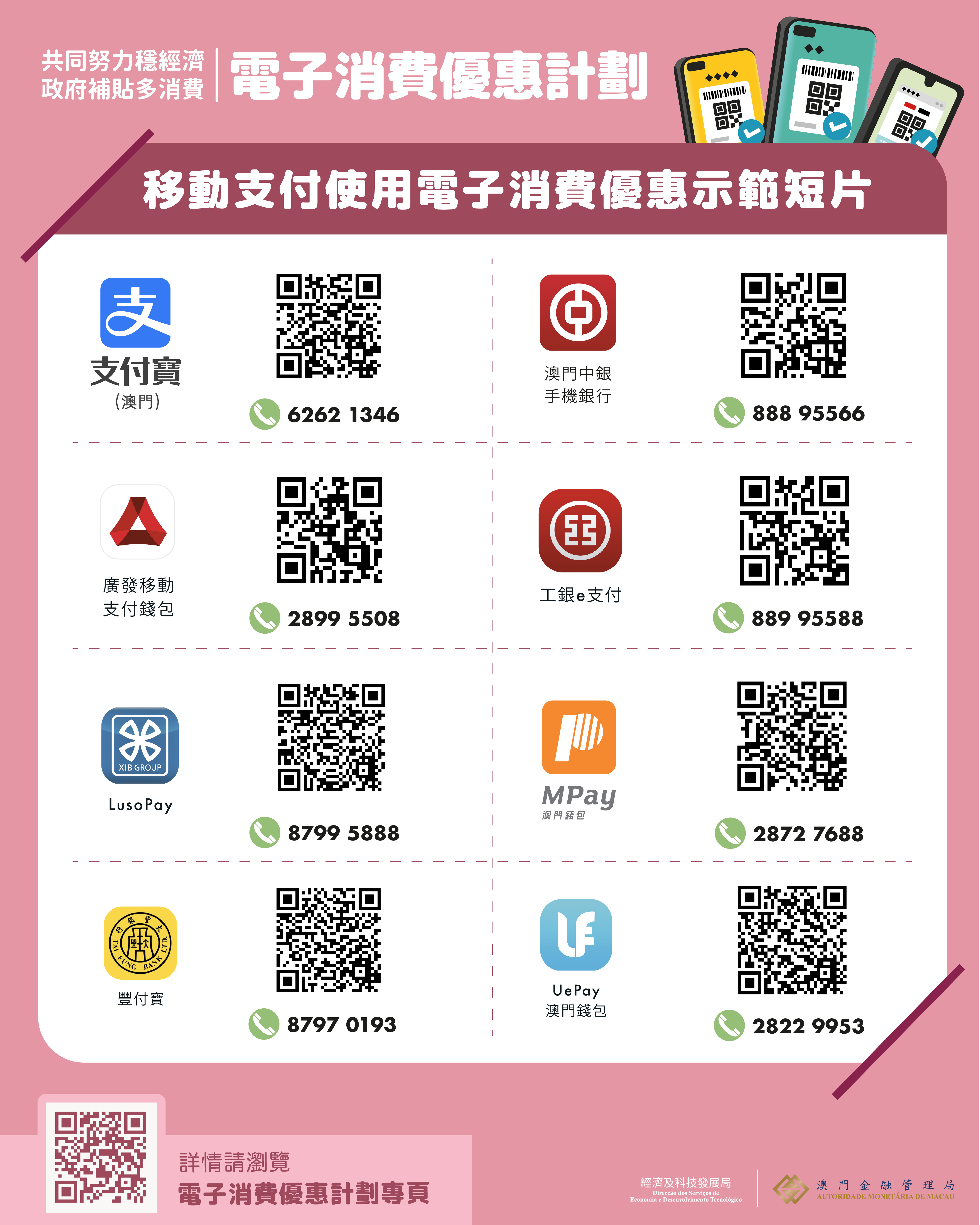 此外,經科局及金管局已協調八家金融機構今日推出“電子消費優惠使用教學視頻”,演示消費付款、查詢餘額或交易詳情等各項功能及步驟。同時,製作圖文包匯集視頻連結,並更新計劃專頁(https://www.dsedt.gov.mo/econsumo/zh_TW/cst_tutorials.jsp)及優化版面配置,方便選擇移動支付的居民瞭解。