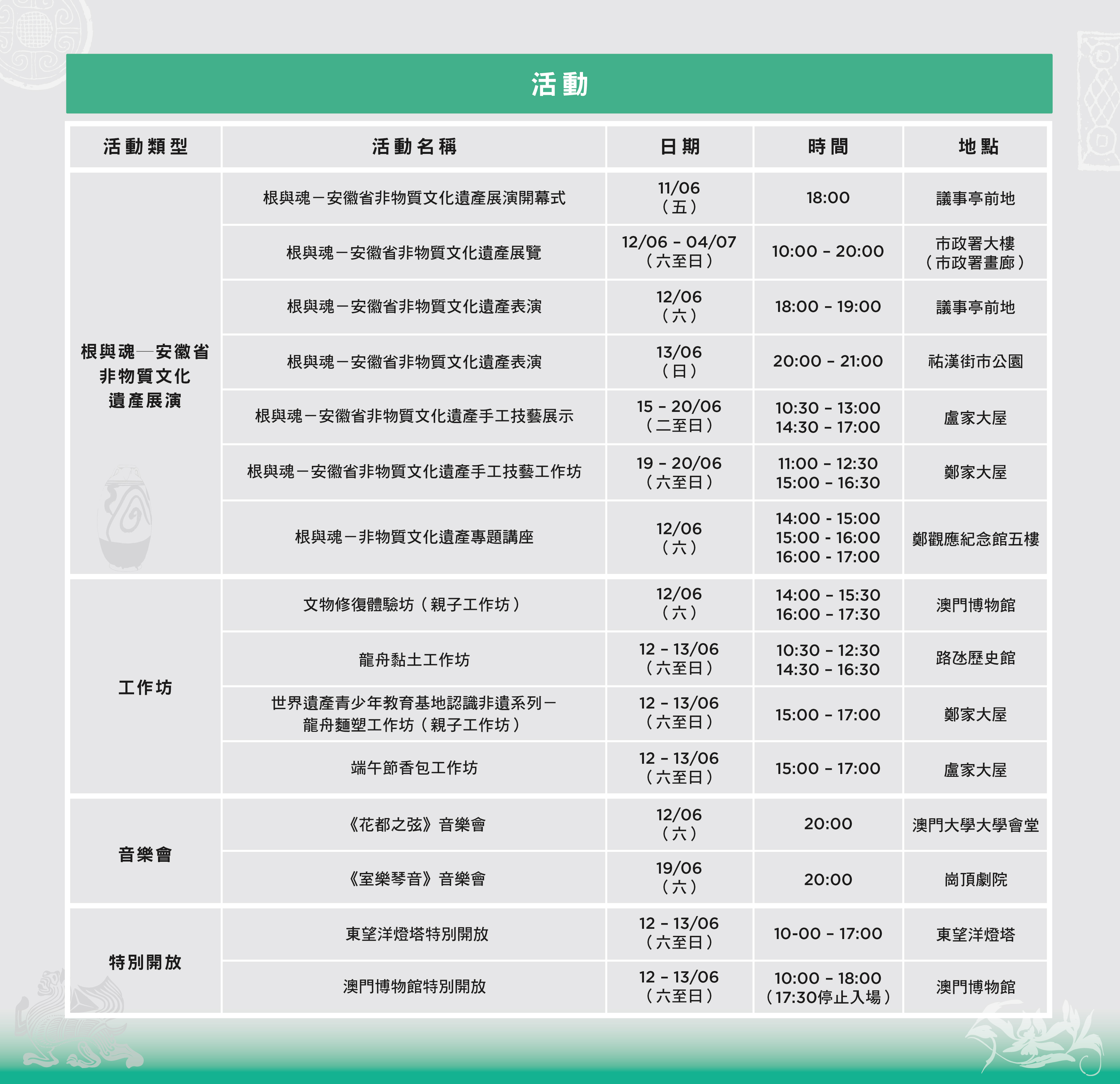 今年的“文化和自然遺產日”亮點項目“根與魂-安徽省非物質文化遺產展演”,由文化和旅遊部、澳門特別行政區政府社會文化司主辦,澳門特別行政區政府文化局、安徽省文化和旅遊廳承辦,中央人民政府駐澳門特別行政區聯絡辦公室宣傳文化部、安徽省非物質文化遺產保護中心、粵港澳大灣區旅遊教育培訓基地協辦,於6月12日至7月4日期間透過不同形式的活動,向澳門市民展示安徽省豐富多彩的非物質文化遺產,包括專題展覽、文藝表演、專題講座、手工藝展示及工作坊,精彩可期。