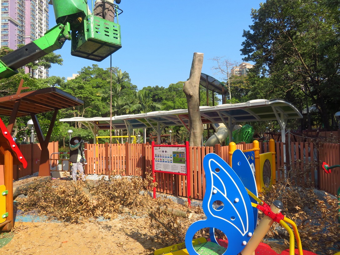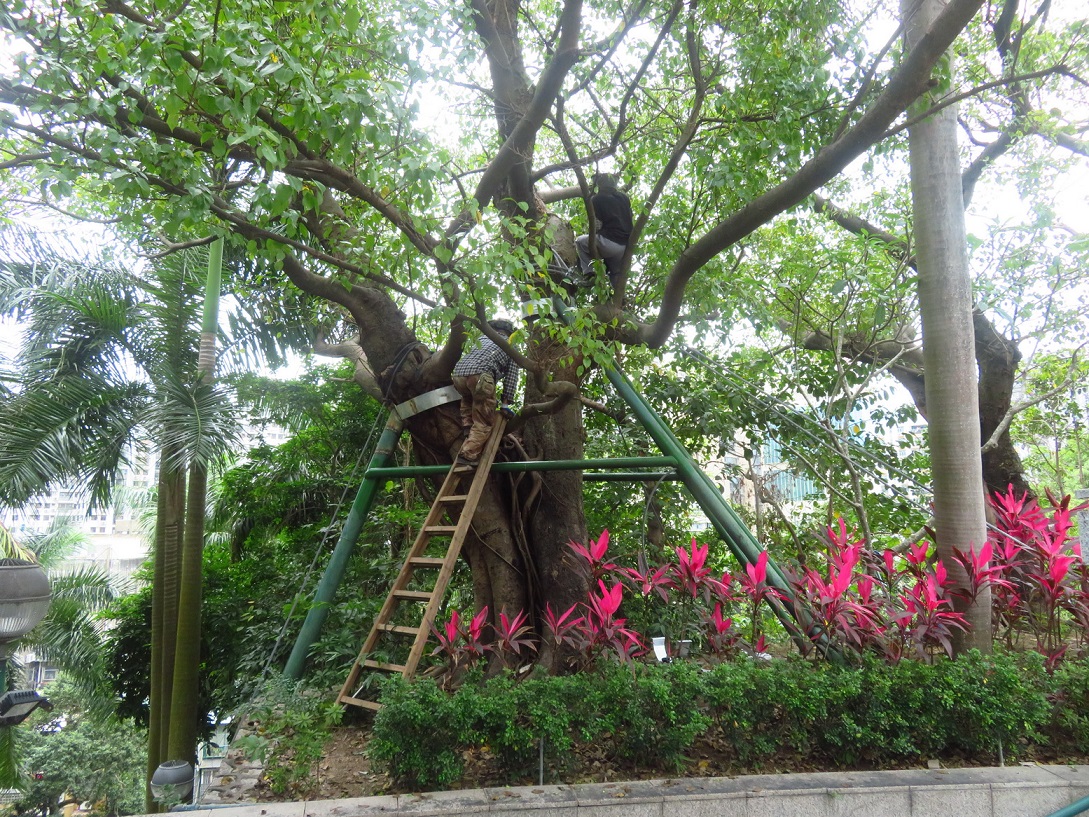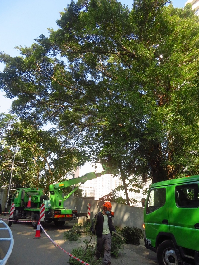 為更好地安排風季前的樹木修剪工作,市政署與交通事務局及治安警察局密切溝通,協調路況以方便人員修剪樹木,有序安排風季前優先疏剪主幹道路樹的樹冠及護理結構差、長勢弱的樹木。至五月,市政署人員已檢查行道樹及綠化帶約14,000株、公園及公園內路旁斜坡約11,000株樹木,修剪超過5,000多株行道樹,移除100多株於城巿及路邊有安全隱患的樹木;於公園有39株樹木因枯萎或感染褐根病而須移除,176株因結構存在危險缺陷及對公眾構成風險而須要修剪,亦完成超過300株樹木風季前預防折枝或倒塌的修剪工作。另外,為傾斜角度大而有倒塌風險的樹木建造、調整及更換大型金屬支撐架,涉及10株於公園的大樹及10株古樹。