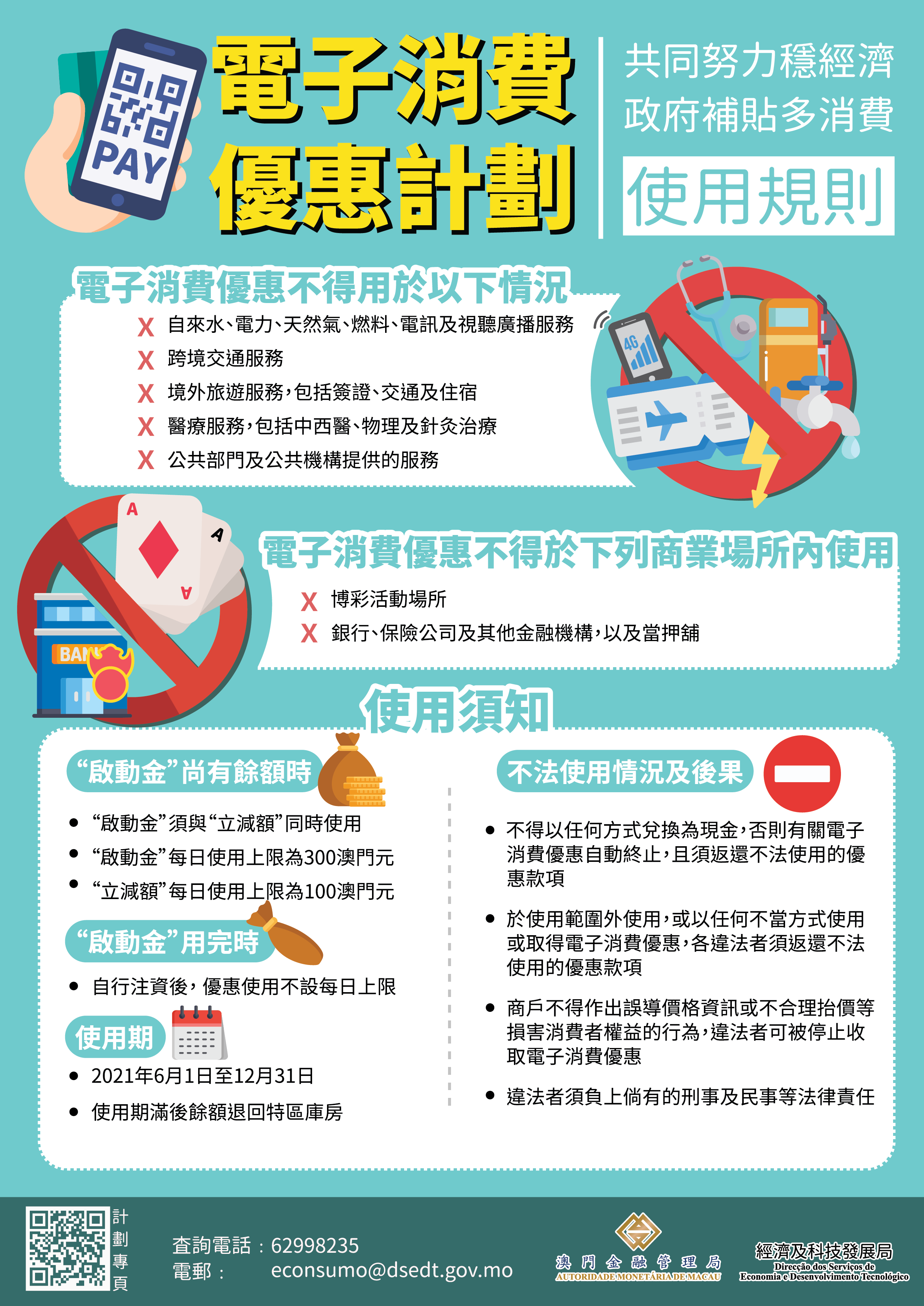 經科局提醒各商戶必須遵守相關法規的規定並做好管理工作,同時也要做好場所的各項防疫措施。如發現違規情況,經科局可按相關行為的嚴重性及過錯程度,停止所屬商業企業主的全部或部分商業場所在指定期間內收取電子消費優惠。