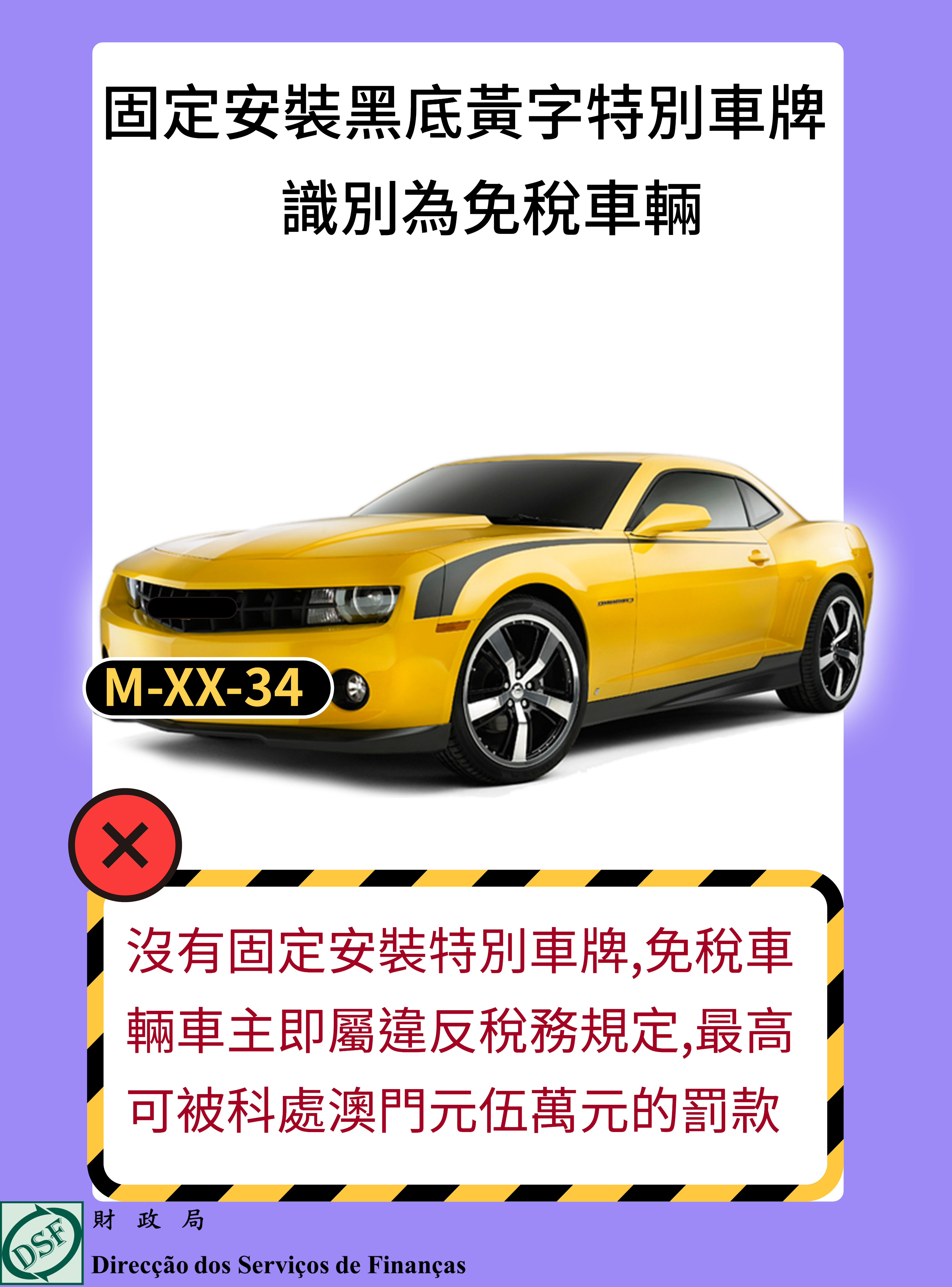 隨著本澳使用石油燃料替代能源(例如純電動汽車或燃氣汽車)的新機動車輛的情況與日俱增,財政局現呼籲獲豁免以上稅項的車主必須遵守《機動車輛稅規章》及《道路法典規章》的相關規定,使用特別車牌:車牌底色應為黑色,字母、數目字及橫劃為黃色,以資識別其為免稅車輛。如違反規定,最高可被科處澳門元伍萬元的罰款。