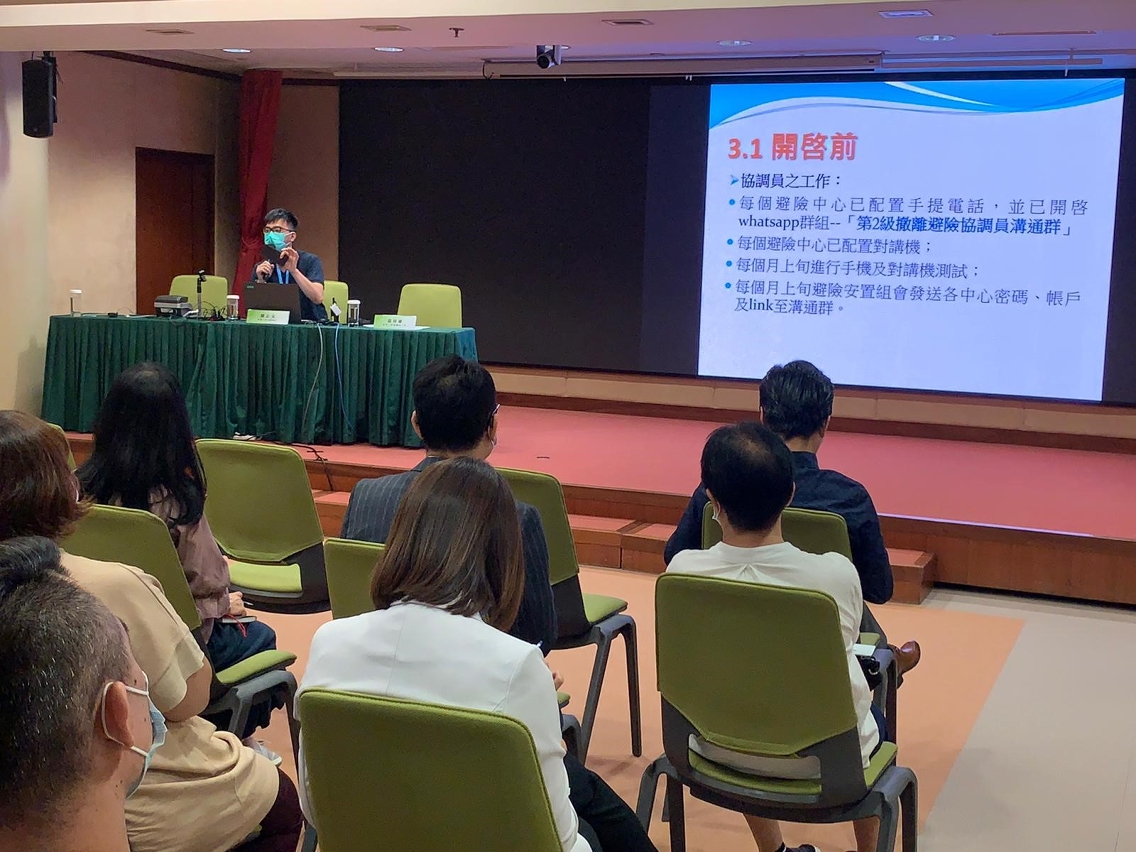 此外,社會工作局向受資助的社服設施、全澳的中小學及幼稚園、政府部門等,派發避險中心開放機制宣傳海報及單張;並聯同警察部門於各區持續進行疏散撤離社區宣傳工作;以及開展避險中心前線工作人員培訓工作等。