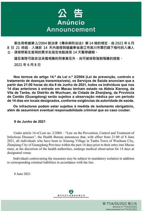 新型冠狀病毒感染應變協調中心宣佈,因應廣東省的疫情變化,衛生局根據第2/2004 號法律《傳染病防治法》第14 條的規定,自 2021年6月8日21時起,所有在入境前14天內曾經到過廣東省湛江市吳川市覃巴鎮下榕村的入境人士,須按照衛生當局的要求在指定地點接受14 天醫學觀察,違反者除可能依法承擔相應的刑事責任外,尚可被採取強制隔離的措施。
