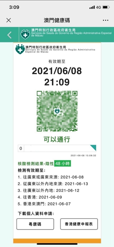 治安警再次提醒過關人士:為確保口岸整體通關效率,請務必每次到達口岸前,提早完成「澳門健康碼」及「粵康碼通關憑證」的申報操作,留意是否有「核酸檢測結果-陰性48小時」字句,並截圖保存作通關時使用。此外,亦請配合現場警員之健康碼的檢查工作,遵從其指示有序行進。