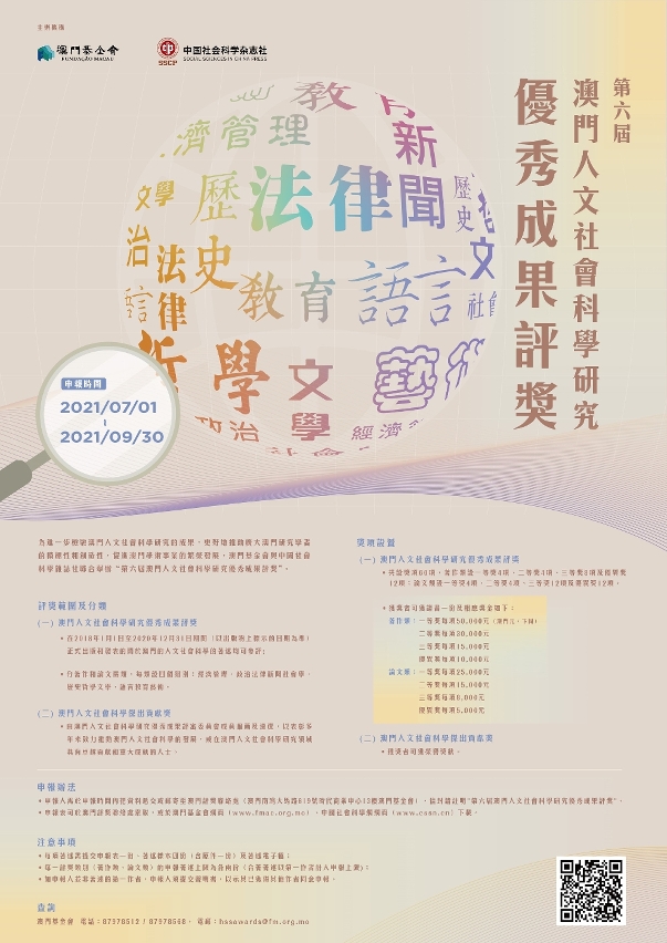由澳門基金會和中國社會科學雜誌社聯合舉辦的“第六屆澳門人文社會科學研究優秀成果評獎”於即日起至2021年9月30日接受申報。