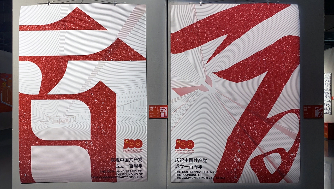 楊超的海報則為組圖,從毛澤東主席的狂草書法中提取“一”字和“百”字,並結合今天常用的宋體字“一百”為主要視覺元素,底紋分別採用黨徽和紅船圖案來表達中國共產黨的百年光輝和紅船精神。