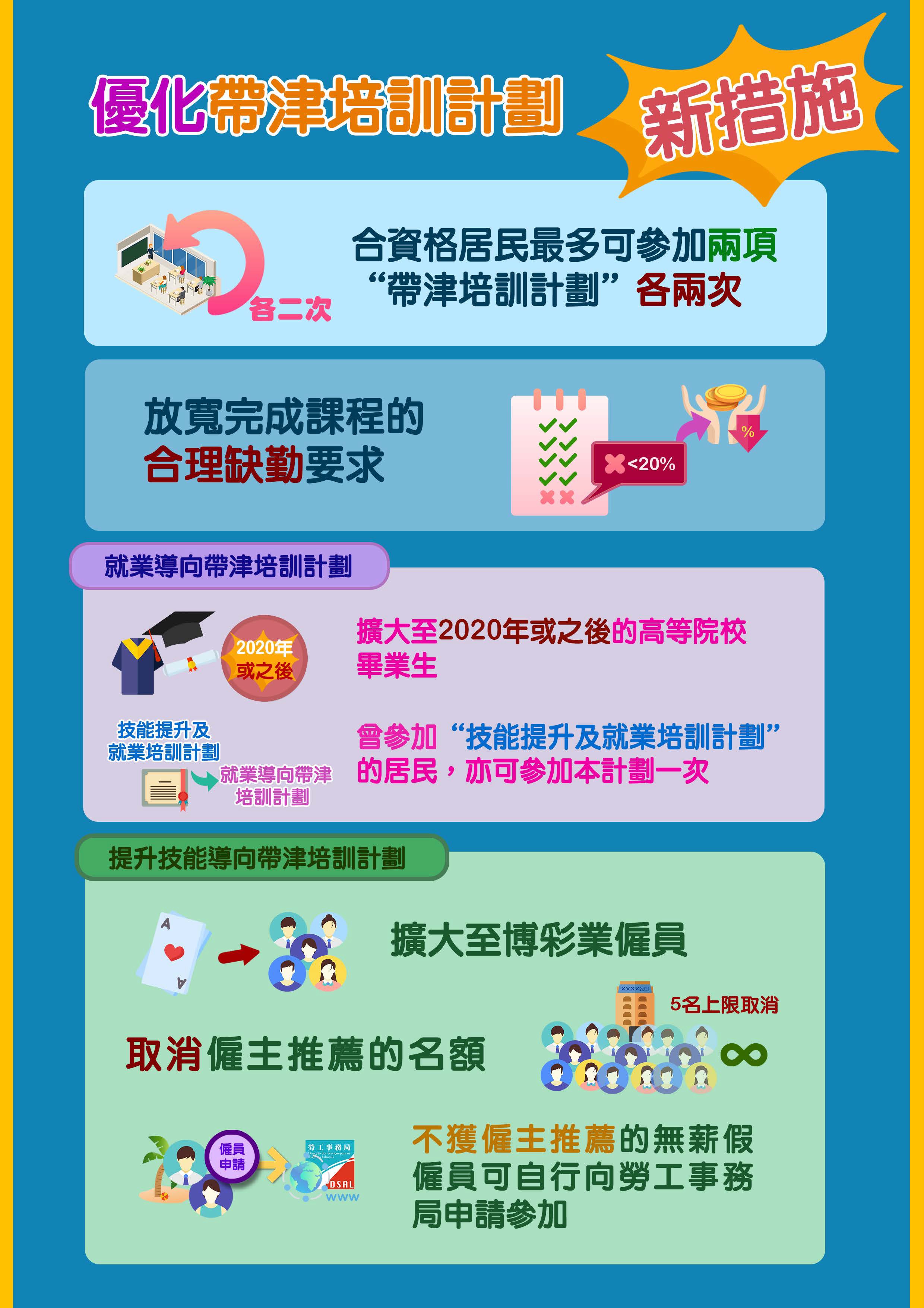 經綜合分析社會各界對“帶津培訓計劃”的意見及計劃實施情況,透過第14/2021號行政法規對第33/2020號行政法規進行修改,在新修訂行政法規下,符合相關計劃資格的居民可分別參加“提升技能導向帶津培訓計劃”及“就業導向帶津培訓計劃”各兩次,“提升技能導向帶津培訓計劃”的就讀對象擴展至博彩業僱員,對處於無薪假狀況且經與僱主溝通但不獲僱主推薦報讀課程人士,可自行申請報讀,並取消僱主推薦僱員的名額限制;而“就業導向帶津培訓計劃” 的參加條件亦擴展至2020年或之後於高等院校畢業且非處於受僱狀態的學生。同時,法規亦放寬完成課程的要求,除因病缺勤的情況外,如出現經申請獲勞工事務局接納的合理缺勤情況,只要總缺勤時數不超過課程總時數的百分之二十,亦視為完成課程,新措施已於5月份招生期實施。