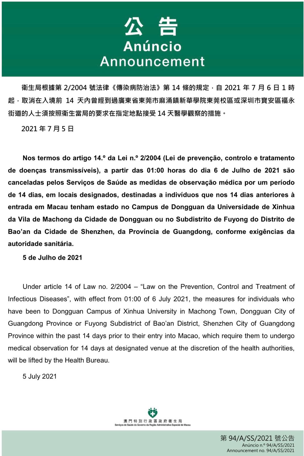 新型冠狀病毒感染應變協調中心宣佈,因應廣東省的疫情變化,衛生局根據第2/2004號法律《傳染病防治法》第14條的規定,自2021年7月6日凌晨1時起,取消在入境前14天內曾經到過廣東省東莞市麻涌鎮新華學院東莞校區、深圳市寶安區福永街道的人士須按照衛生當局的要求在指定地點接受14天醫學觀察的措施。