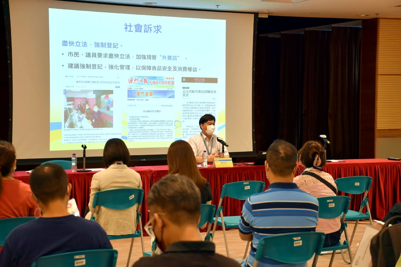 四場業界專場說明會分別於六月二十八至三十日在沙梨頭街市市政綜合大樓禮堂舉辦,共二百五十多名外賣食品業界以及第三方外賣平台代表出席。會上,市政署食品安全廳廳長張桂達向與會者介紹本澳外賣場所經營的現狀及食安監管工作,並詳細說明建議中的《外賣食品活動場所的登記制度》其立法考量、目的、適用範圍,以及電子化申請服務等。