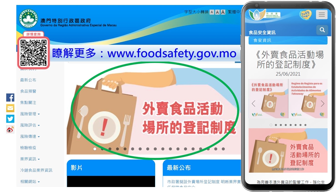 有關《外賣食品活動場所的登記制度》的建議草案內容,可登入食安資訊網www.foodsafety.gov.mo或食安資訊流動應用程式(App)的「外賣食品活動場所的登記制度」專頁查閱詳情。