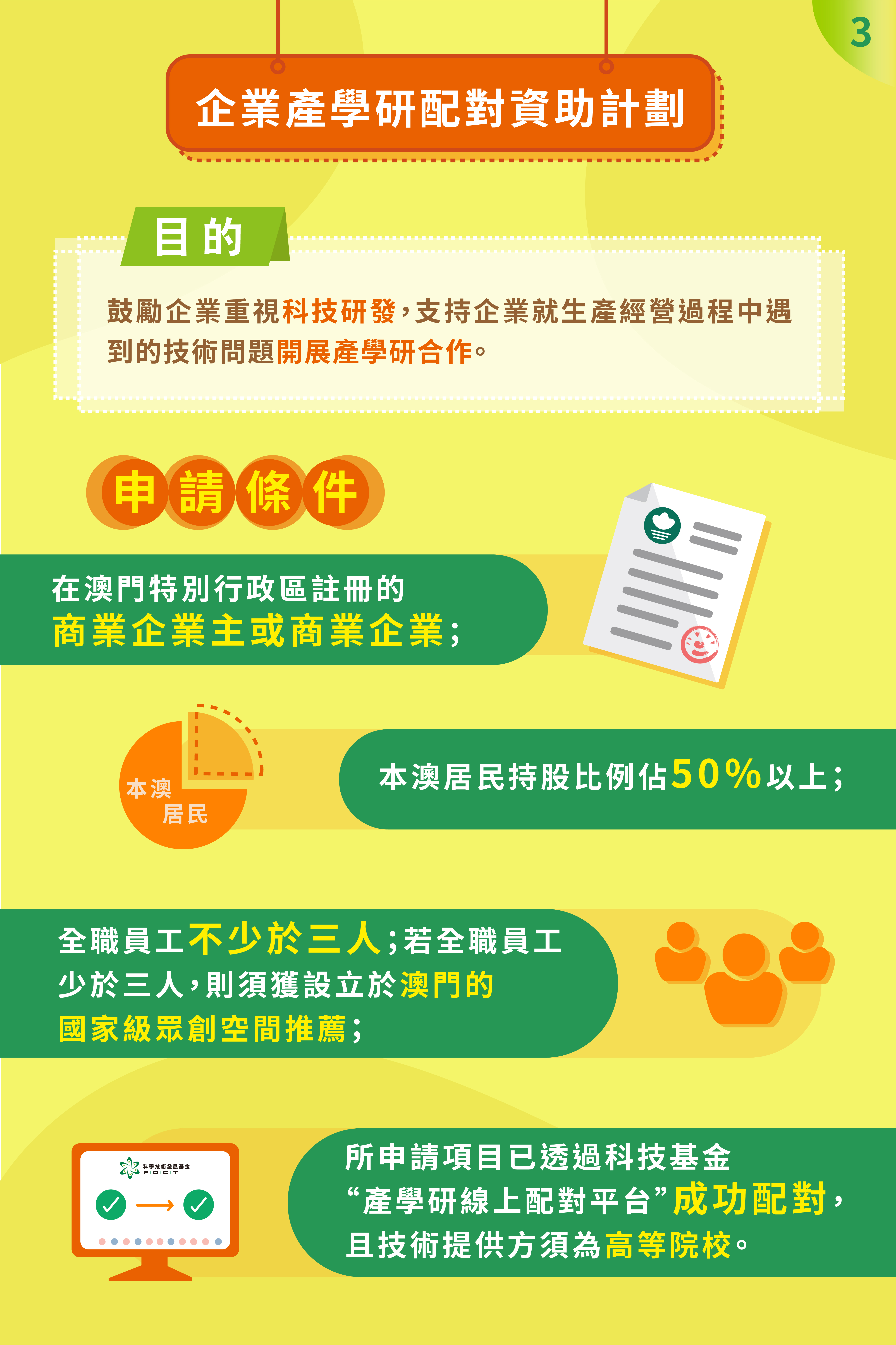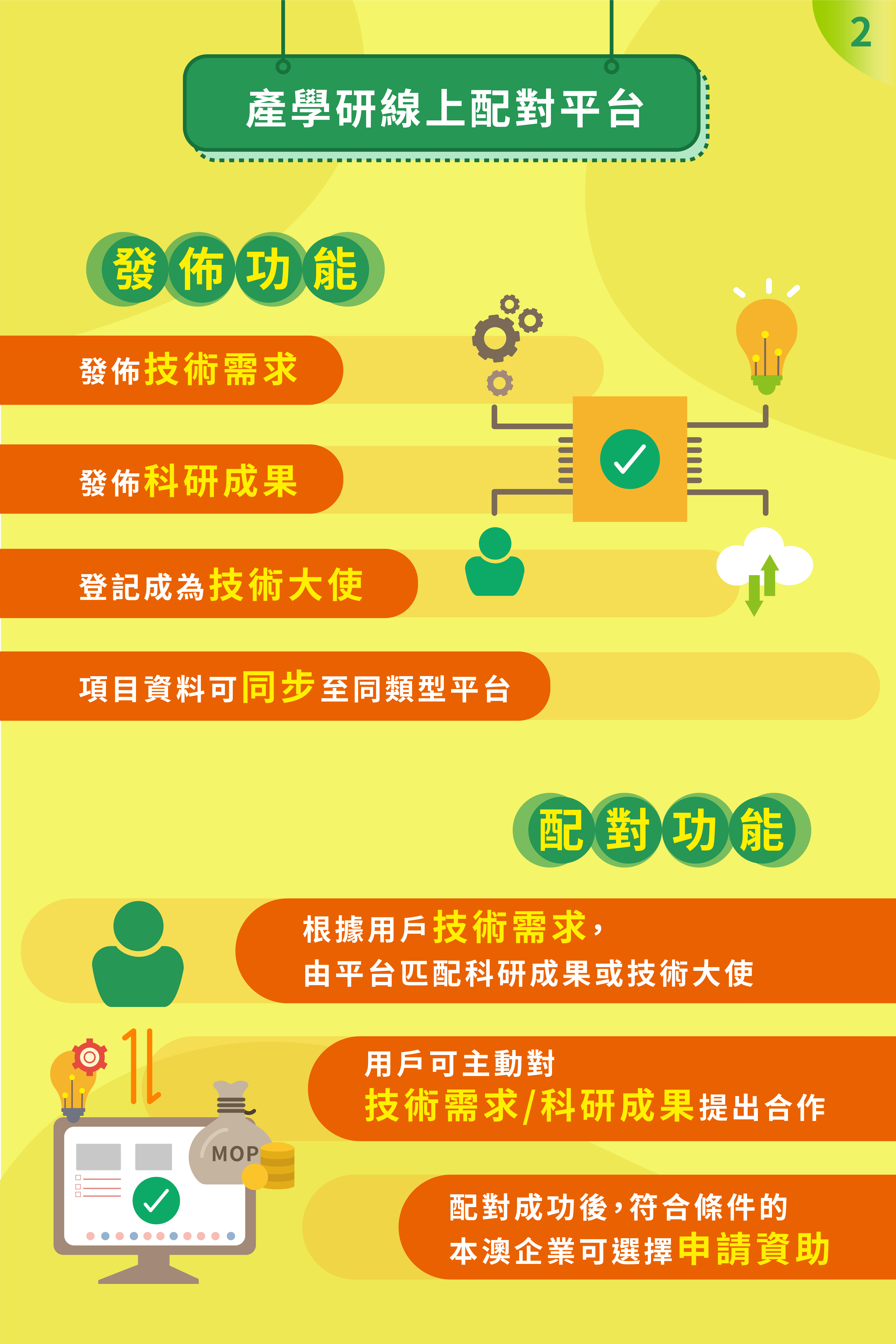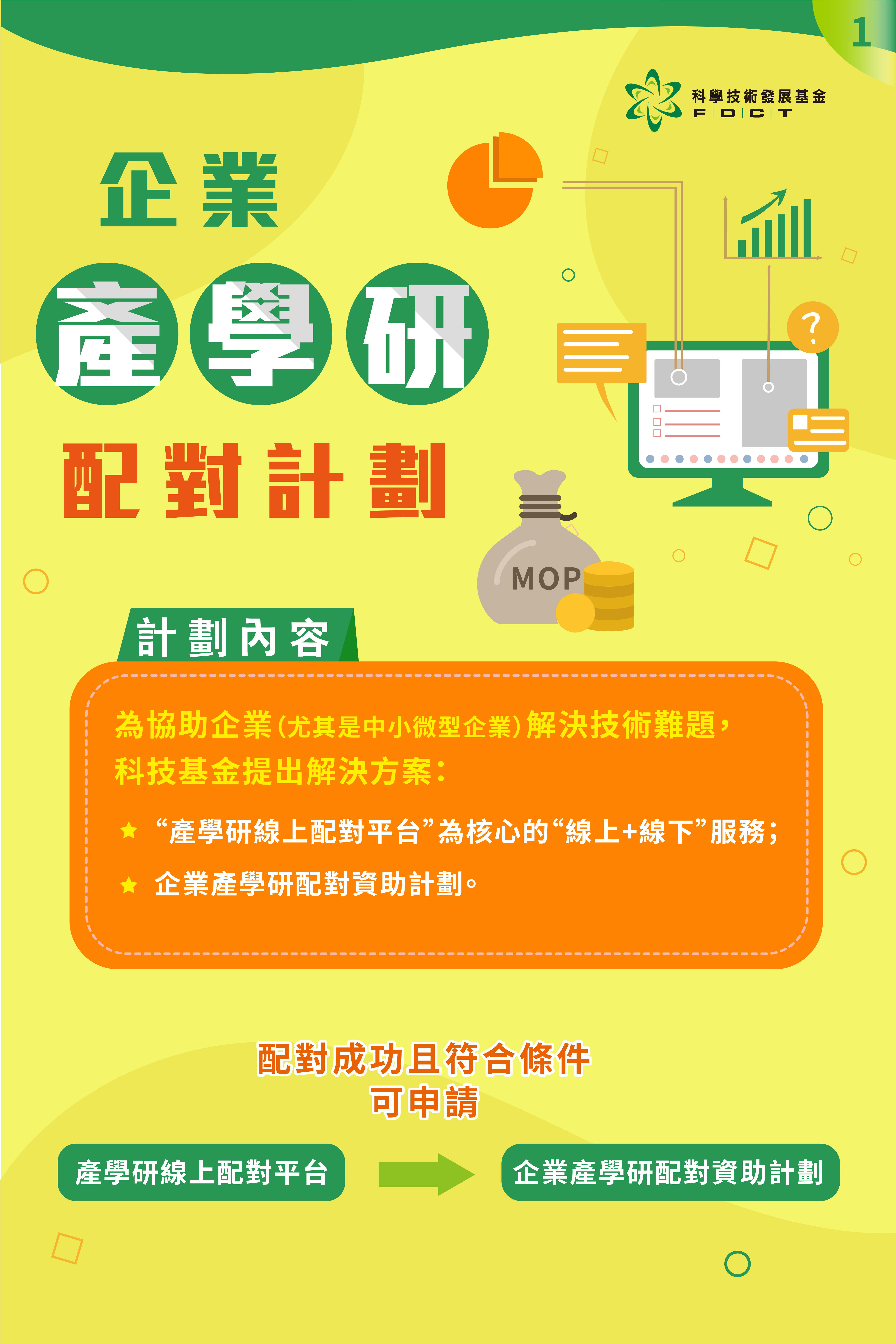 科學技術發展基金(下稱:科技基金)已推出“企業產學研配對資助計劃”(下稱:資助計劃),並提供“線上+線下”結合的產學研配對服務,協助企業解決攻克技術難題時遇到的經費不足及技術方案缺乏的問題。科技基金期望透過資助加配對服務的模式,支持本澳企業升級轉型,推動成果及解決方案的落地。
