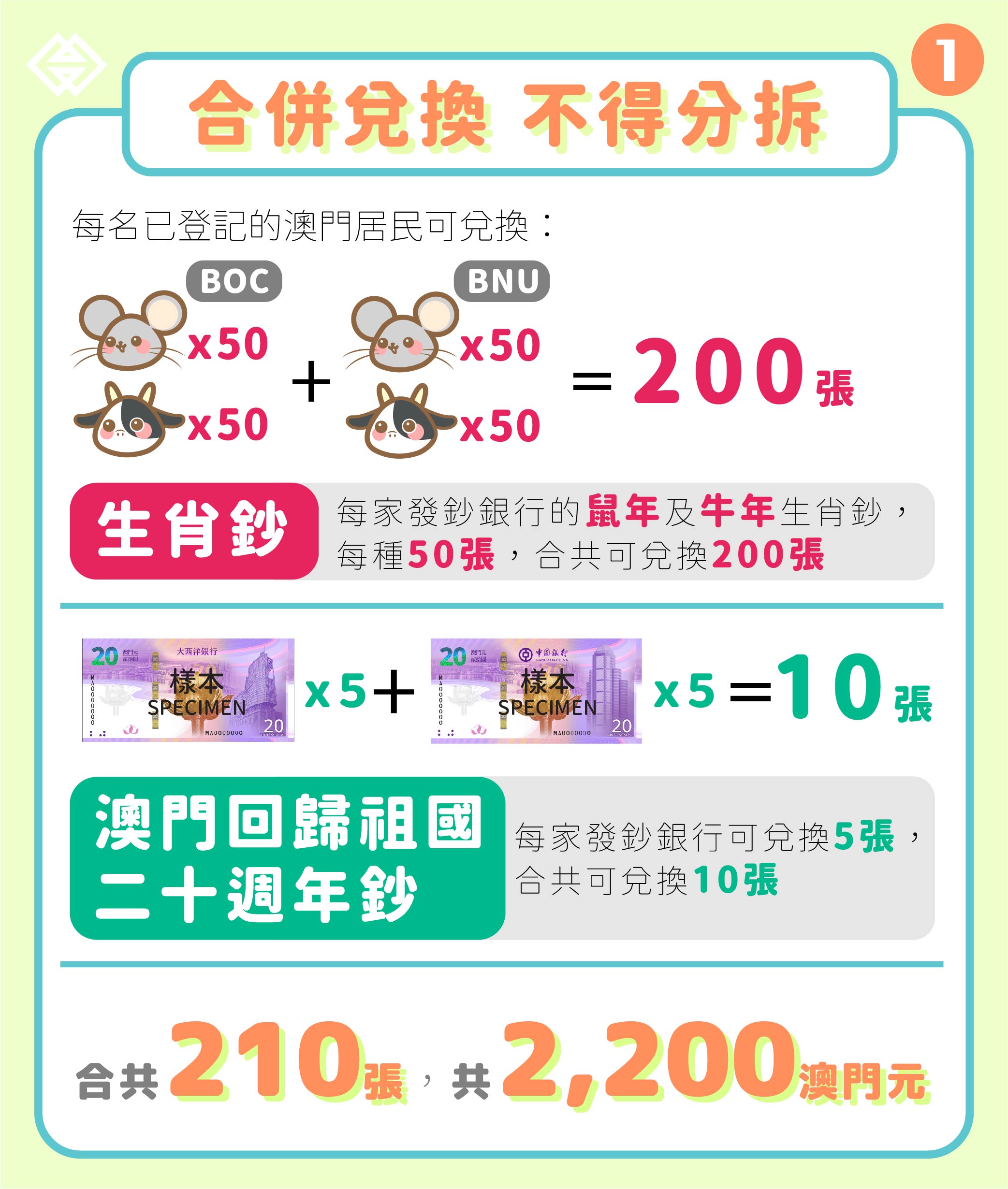 鼠年、牛年生肖鈔及澳門回歸祖國二十週年鈔 兌換期將於下週五結束