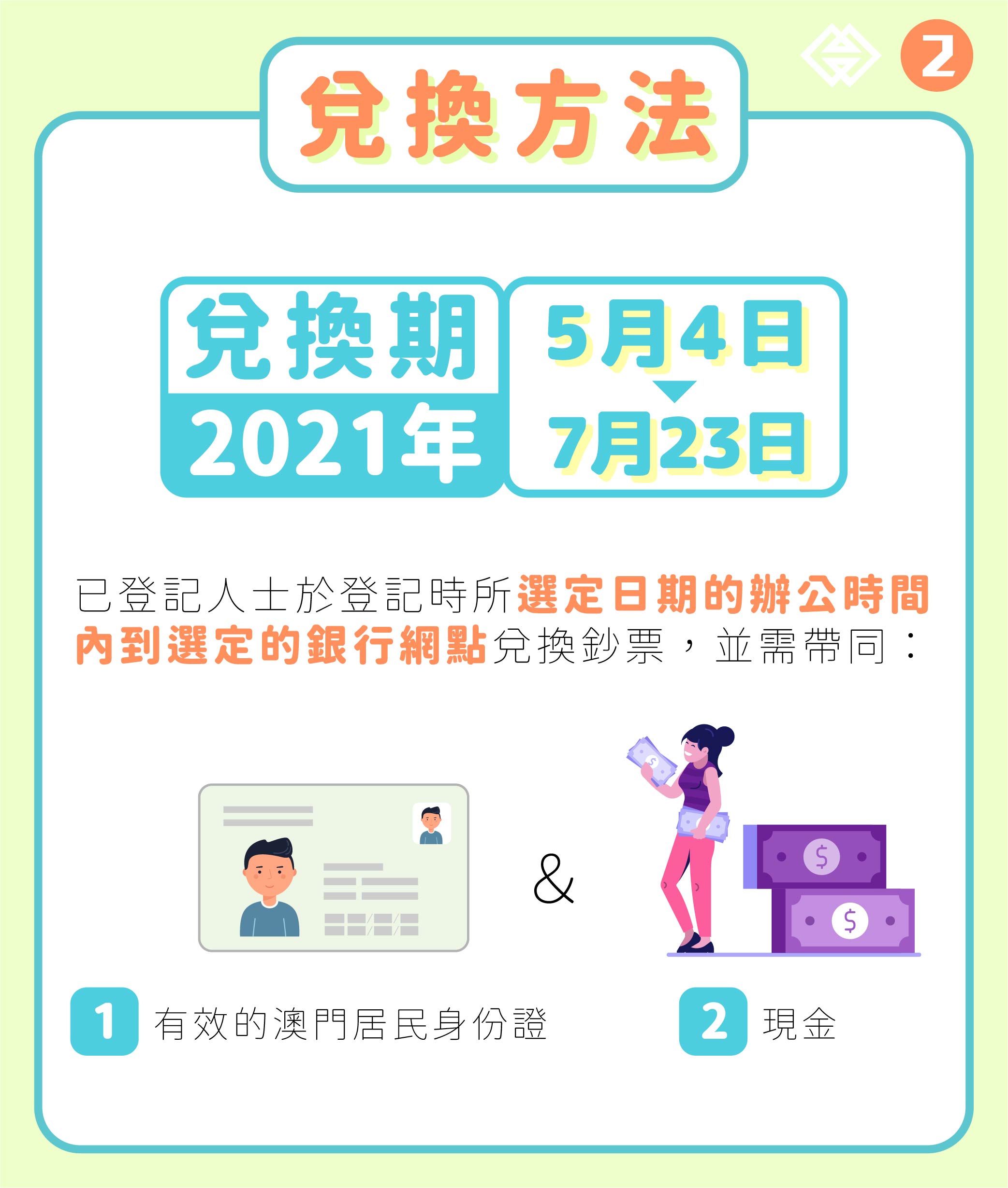 按照既定安排,鼠年、牛年生肖鈔,及早前已發行的澳門回歸祖國二十週年鈔的兌換期將於2021年7月23日(星期五)結束。澳門金融管理局呼籲,已完成網上登記但尚未辦理兌換的人士,請於餘下的兌換期內,前往所選定的銀行網點進行兌換。