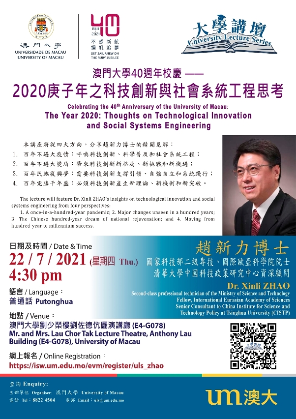 澳門大學將於7月22日(星期四)舉辦“澳門大學40週年校慶——大學講壇”,由國家科技部專家趙新力以“2020庚子年之科技創新與社會系統工程思考”為題發表演說,探討新時代下的科技創新和社會系統工程。