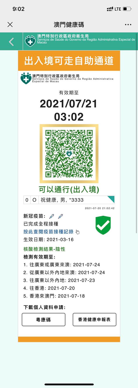 新型冠狀病毒感染應變協調中心(下稱應變協調中心)表示,為了要突顯已完成全程接種新冠病毒疫苗人士的狀態,明(21)日零時起,將在所有已完成接種兩劑新冠病毒疫苗14天後的人士的“澳門健康碼”二維碼外圍會加上金色外框,並在下方疫苗記錄位置顯示“已完成全程接種”字樣。