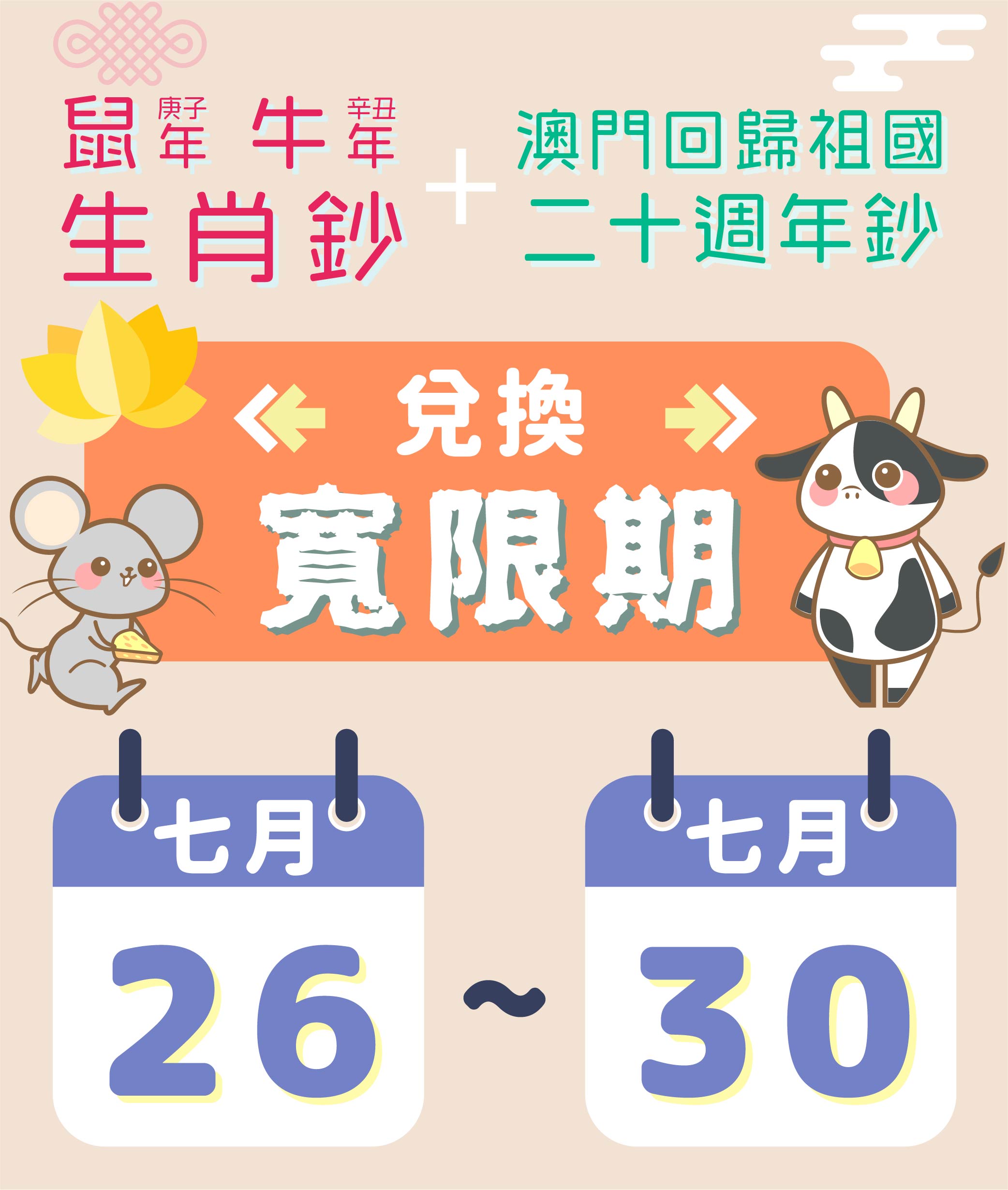 兌換鼠年、牛年生肖鈔及澳門回歸祖國二十週年鈔的寬限期