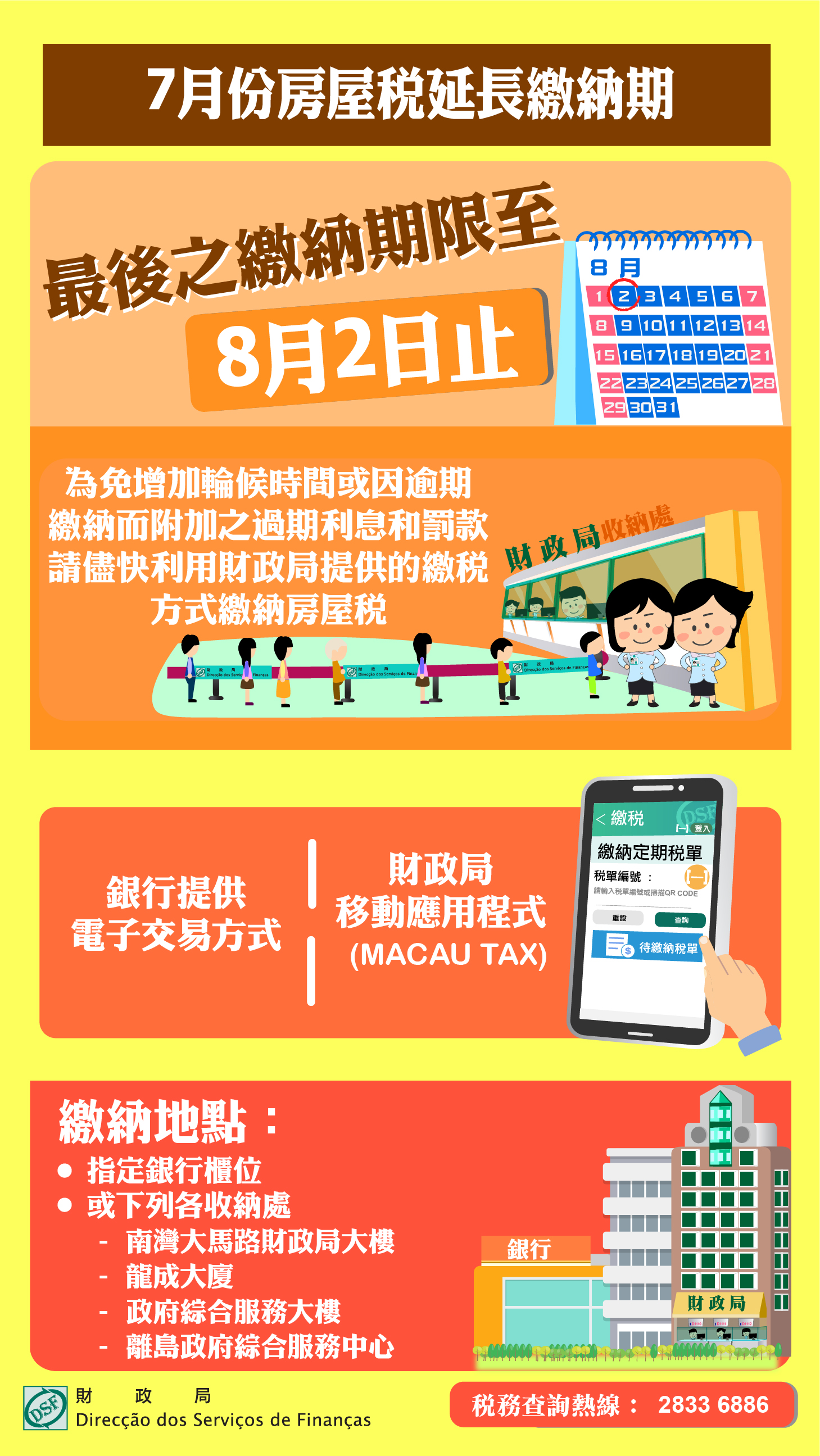 鑑於7月31日為星期六,繳納月份為7月之房屋稅稅款,其繳納期限延至8月2日(星期一)止,為免因逾期繳納而附加之過期利息和罰款,財政局呼籲倘仍未繳納上述房屋稅之納稅人,請儘快利用財政局提供的繳稅方式繳納房屋稅,亦可於辦公時間內,到指定銀行櫃位,以及透過銀行提供電子交易方式,另外,可使用財政局移動應用程式(MACAU TAX)掃瞄徵稅憑單上之二維碼,利用有關移動支付平台繳交稅款,或於財政局大樓、龍成大廈、政府綜合服務大樓及離島政府綜合服務中心收納處繳交,為便於繳納,納稅人憑澳門居民身份證於自助服務機,可列印稅單摘要,資料可供自動櫃員機及銀行提供電子交易繳納稅款,又或者於財政局自助服務機補印稅單交稅。