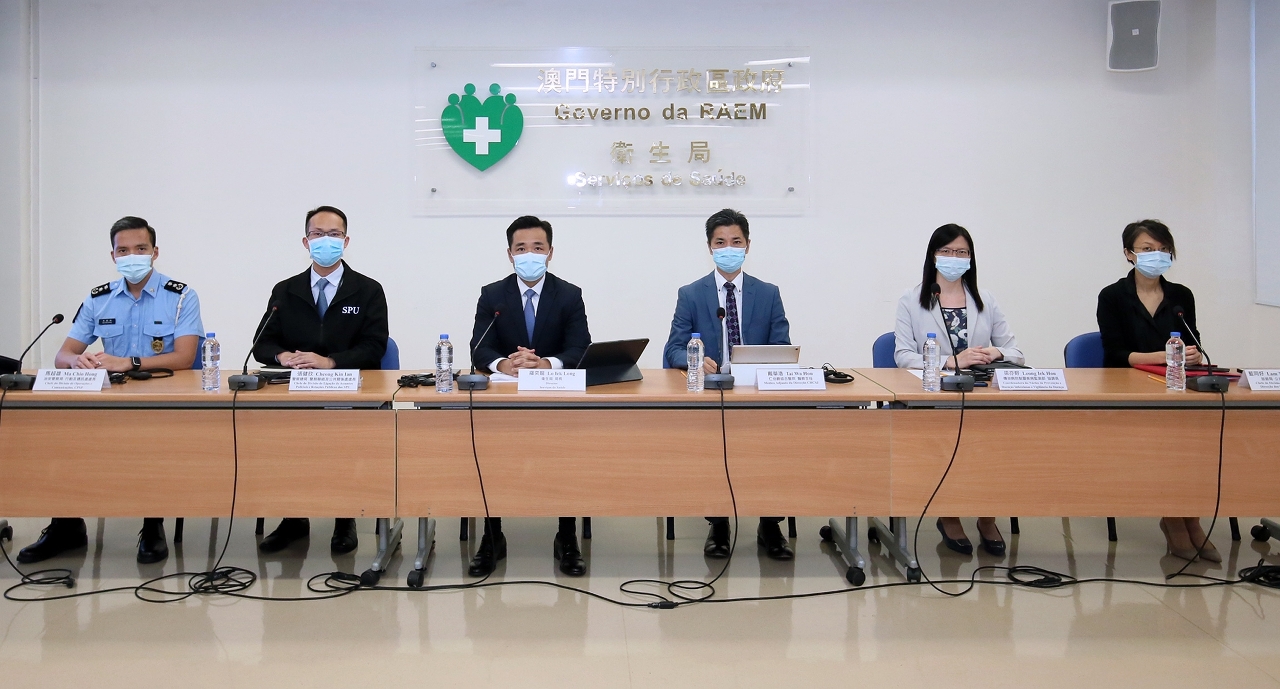 新型冠狀病毒感染應變協調中心(下稱應變協調中心)於今(7)日舉行記者會,衛生局羅奕龍局長、仁伯爵綜合醫院醫務主任戴華浩醫生、旅遊局公共關係處藍同好處長、警察總局警務聯絡及公共關係處張健欣處長、治安警察局行動及通訊處馬超雄處長、疾病預防控制中心傳染病防制暨疾病監測部梁亦好協調員共同會見傳媒。