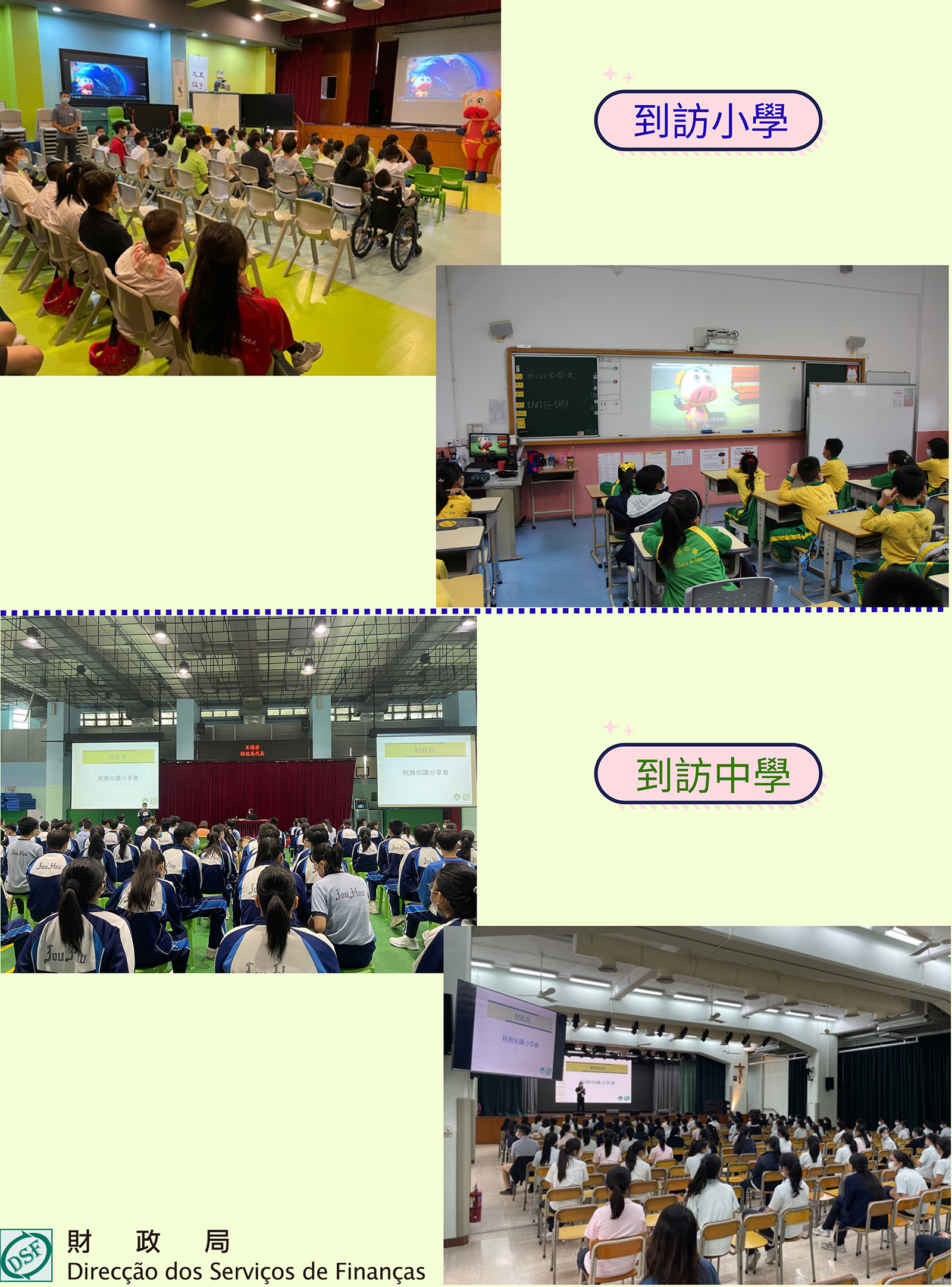 自本年3月起,財政局派員到訪多所學校,小學計有:氹仔中葡學校、鏡平學校、聖善學校、教業中學、明愛學校及中德學校。先是為小學生們播放動畫故事“税税豬藍星遊記”,透過故事寓教於樂,引導他們了解稅收理念是“取之於民,用之於民”,讓其明白報稅納稅是每個澳門市民應盡的公民義務。