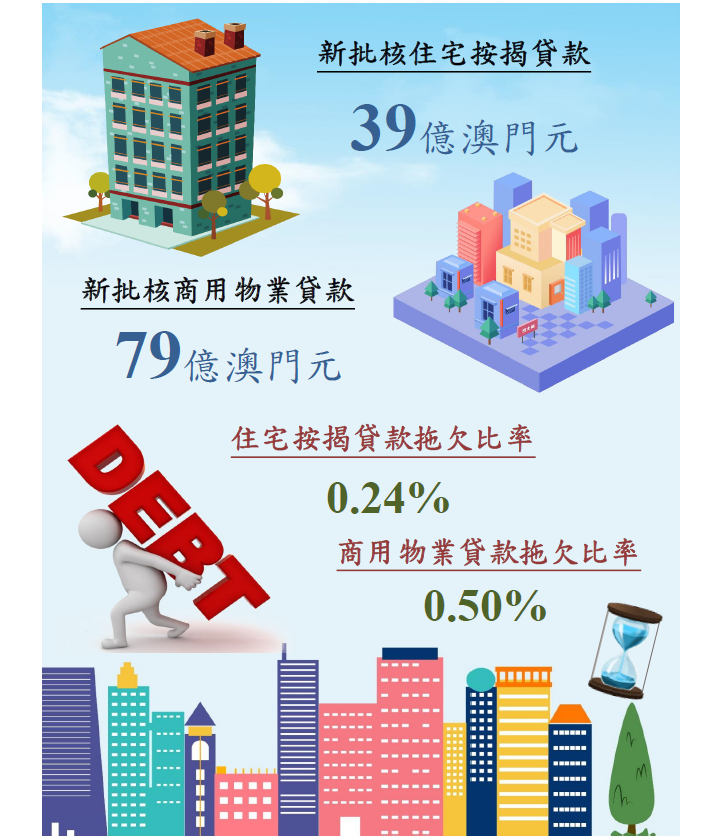 未償還商用物業貸款總額為1,613.0億澳門元,按月增加1.2%,而與一年前比較則減少10.3%;其中,居民部份佔93.2%。與一個月前比較,居民部份的未償還商用物業貸款上升1.3%,而非居民部份則下跌0.6%。