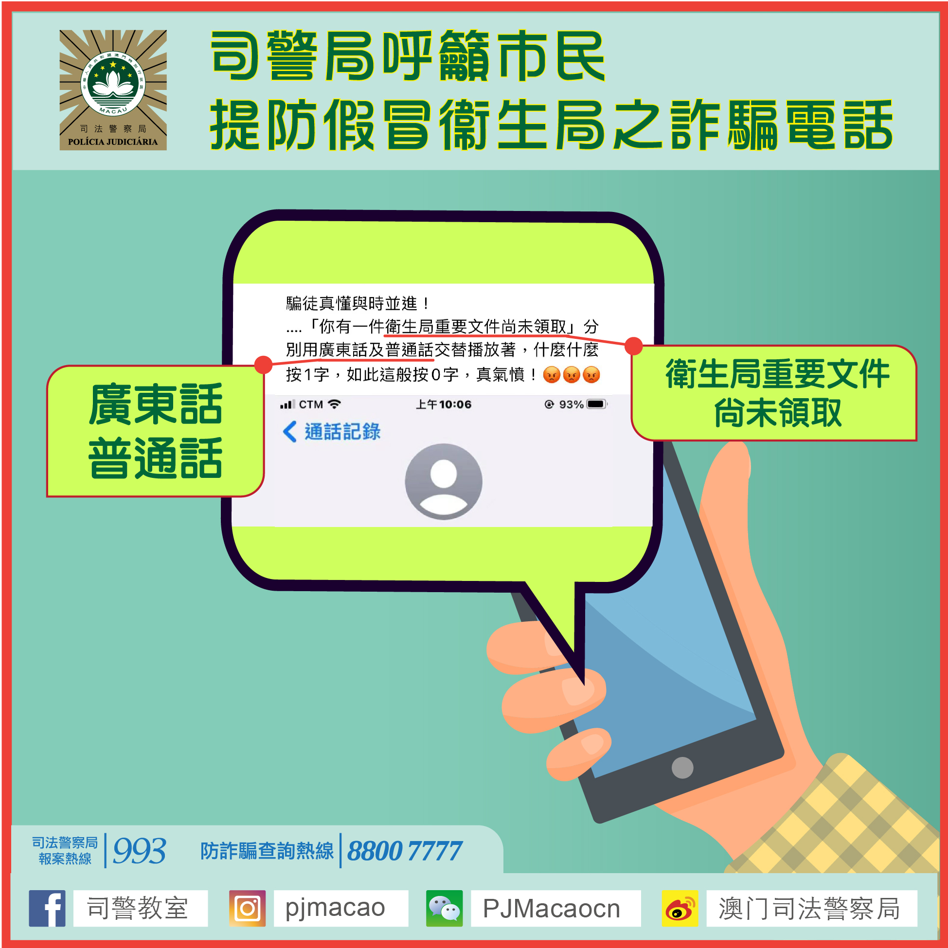 司警局近日接獲市民舉報,指其手機接到一通以廣東話和普通話交替播放的語音訊息陌生來電,內容稱事主有一件“衛生局重要文件”尚未領取,事主覺得可疑立即掛線,並馬上向司警局舉報。