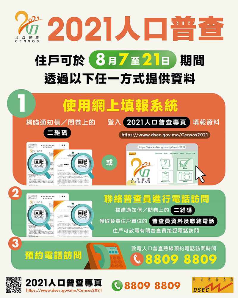 人口普查結果反映澳門人口結構及其社會、經濟特徵的變化,是特區政府規劃未來的重要參考。統計局呼籲全澳市民配合人口普查,盡早提供資料。完成填報的住戶即自動進入“合作填報 越早越著數”抽獎。有關人口普查詳情,請瀏覽2021人口普查專頁(https://www.dsec.gov.mo/Censos2021),或致電人口普查熱線8809 8809查詢。
