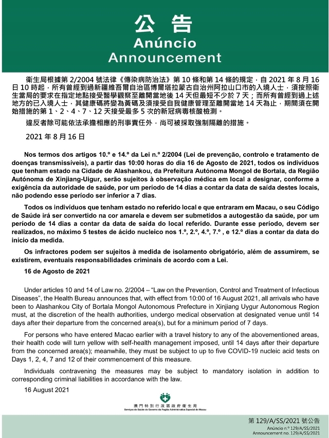 新型冠狀病毒感染應變協調中心宣佈,因應新疆維吾爾自治區的疫情變化,衛生局根據第2/2004號法律《傳染病防治法》第10條和第14條的規定,自2021年8月16日上午10時起,所有曾經到過新疆維吾爾自治區博爾塔拉蒙古自治州阿拉山口市的入境人士,須按照衛生當局的要求在指定地點接受醫學觀察至離開當地後14天但最短不少於7天;而所有曾經到過上述地方的已入境人士,其健康碼將變為黃碼及須接受自我健康管理至離開當地 14 天為止,期間須在開始措施的第 1、2、4、7、12 天接受最多 5 次的新冠病毒核酸檢測。免費核酸檢測預約連結為https://app.ssm.gov.mo/mandatoryrnatestbook。核酸檢測結果不會上載至澳門健康碼亦不可作為出入境用途。如需將核酸檢測結果在澳門健康碼顯示,則須自費檢測。