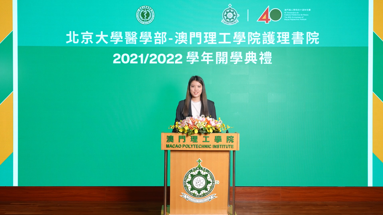 護理書院新生代表麥早慧在發言中感謝兩校的合作,讓自己有幸成為護理書院首屆新生,見證著歷史時刻的誕生。同時表示,一定會好好珍惜把握前往北京大學醫學部交流學習及實習這一難得機會。在新學年好好學習,裝備自己,打開全新精彩的人生篇章,在北京大學醫學部—澳門理工學院護理書院“築夢青春"。