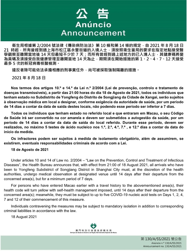 新型冠狀病毒感染應變協調中心宣佈,因應上海市的疫情變化,衛生局根據第2/2004號法律《傳染病防治法》第10條和第14條的規定,自2021年8月18日晚上9時起,所有曾經到過上海市松江區永豐街道的入境人士,須按照衛生當局的要求在指定地點接受醫學觀察至離開當地後14天但最短不少於7天;而所有曾經到過上述地方的已入境人士,其健康碼將變為黃碼及須接受自我健康管理至離開當地 14 天為止,期間須在開始措施的第 1、2、4、7、12 天接受最多 5 次的新冠病毒核酸檢測。免費核酸檢測預約連結為https://app.ssm.gov.mo/mandatoryrnatestbook。核酸檢測結果不會上載至澳門健康碼亦不可作為出入境用途。如需將核酸檢測結果在澳門健康碼顯示,則須自費檢測。