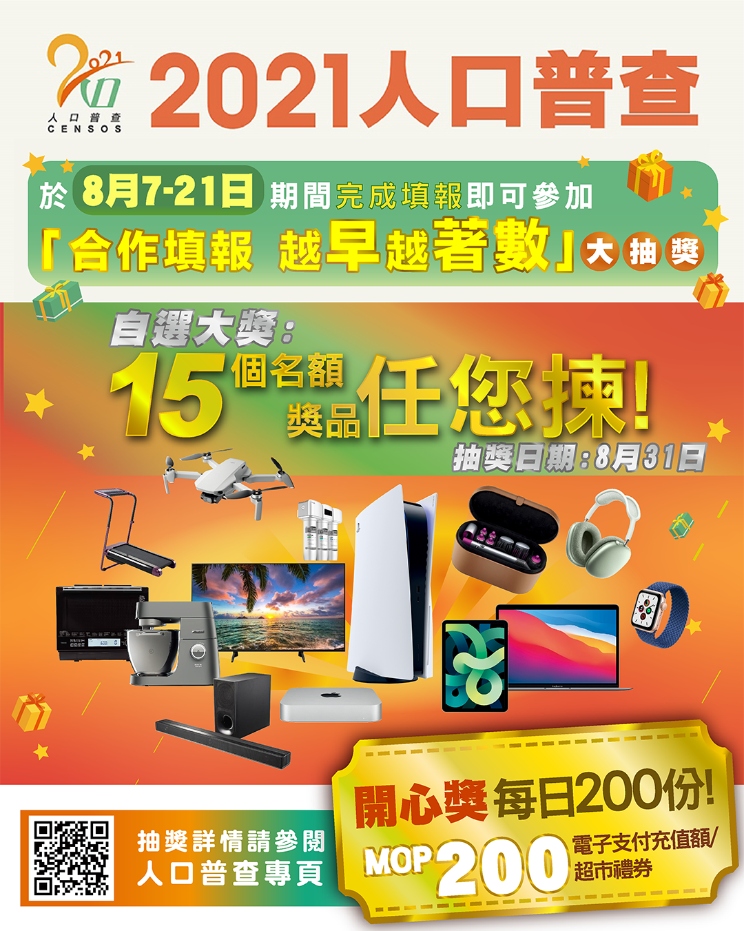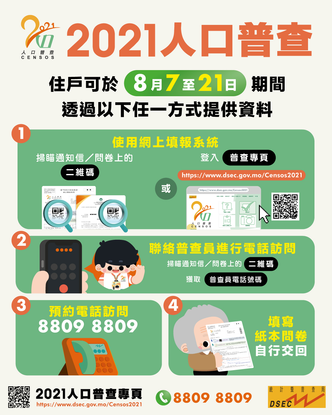 有關人口普查詳情,請瀏覽2021人口普查專頁(https://www.dsec.gov.mo/Censos2021)或致電人口普查熱線8809 8809查詢。