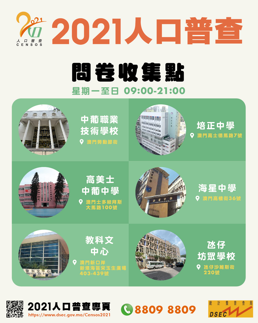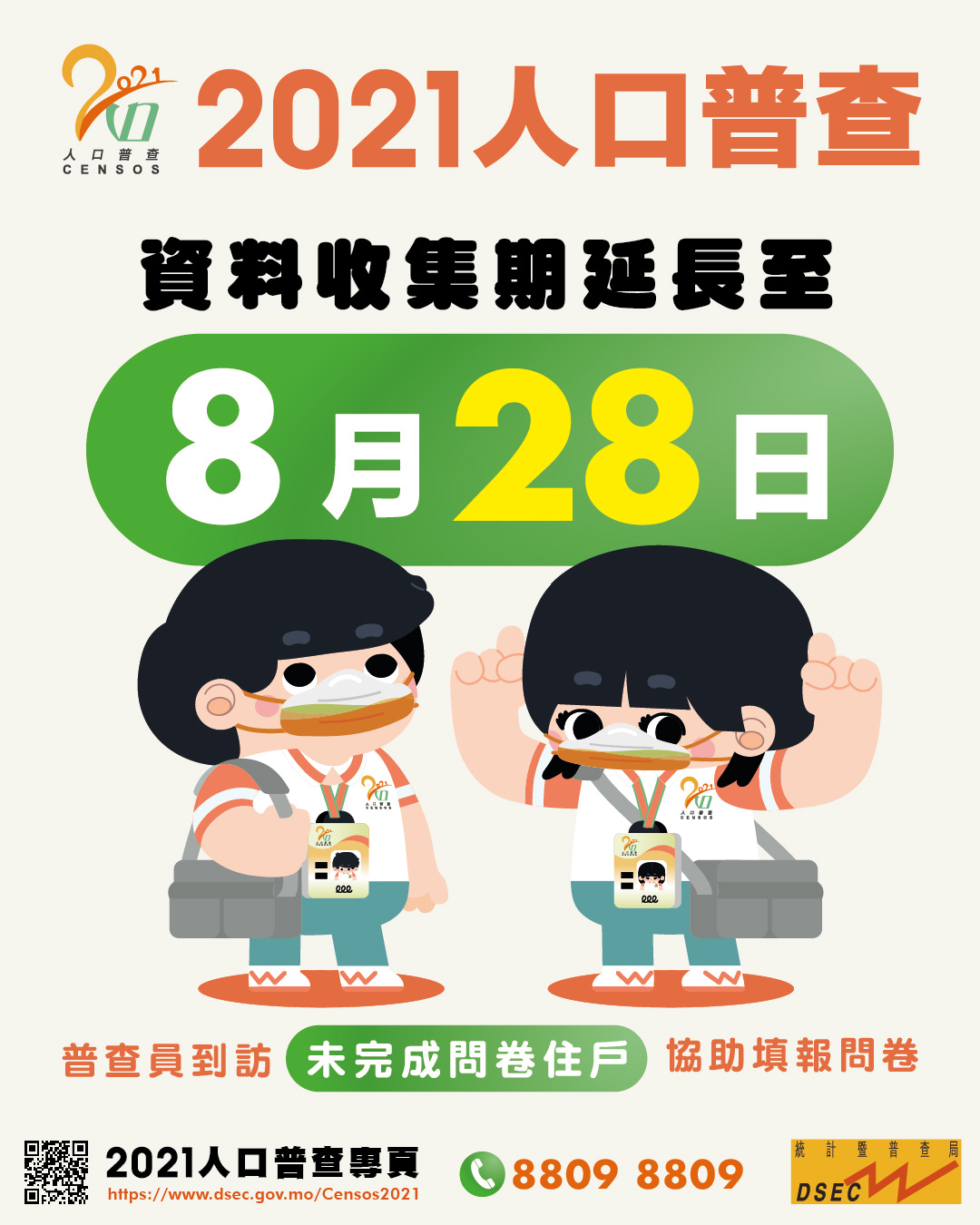 統計局呼籲全澳市民配合人口普查,盡早提供資料。有關人口普查詳情,請瀏覽2021人口普查專頁(https://www.dsec.gov.mo/Censos2021),或致電人口普查熱線8809 8809查詢。