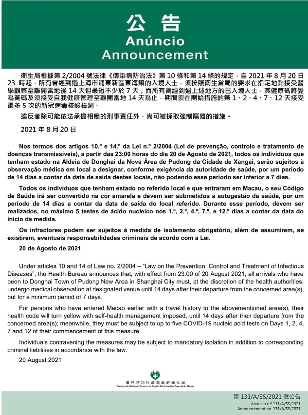 新型冠狀病毒感染應變協調中心宣佈,因應上海市的疫情變化,衛生局根據第2/2004號法律《傳染病防治法》第10條和第14條的規定,自2021年8月20日晚上11時起,所有曾經到過上海市浦東新區東海鎮的入境人士,須按照衛生當局的要求在指定地點接受醫學觀察至離開當地後14天但最短不少於7天;而所有曾經到過上述地方的已入境人士,其健康碼將變為黃碼及須接受自我健康管理至離開當地 14 天為止,期間須在開始措施的第 1、2、4、7、12 天接受最多 5 次的新冠病毒核酸檢測。免費核酸檢測預約連結為https://app.ssm.gov.mo/mandatoryrnatestbook。核酸檢測結果不會上載至澳門健康碼亦不可作為出入境用途。如需將核酸檢測結果在澳門健康碼顯示,則須自費檢測。