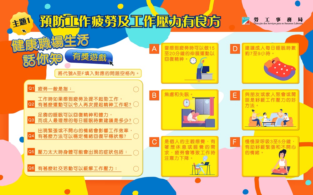 有獎遊戲由即日起至11月分四期推出。第一至四期的主題分別是“預防工作疲勞及工作壓力”、“職業性肌肉筋骨勞損”、“工作與血壓的關係”及“預防下肢勞損”,多方面向巿民介紹相關職業健康知識。