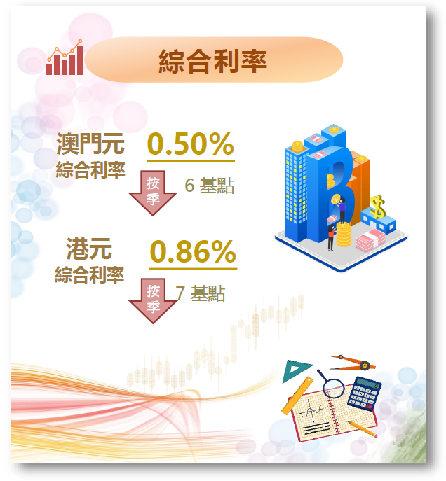 截至2021年6月底,澳門元及港元綜合利率從2021年3月底的0.56%及0.93%,分別下降6 基點及7基點至0.50%及0.86%,反映2021年第二季本地銀行的資金成本普遍下跌。