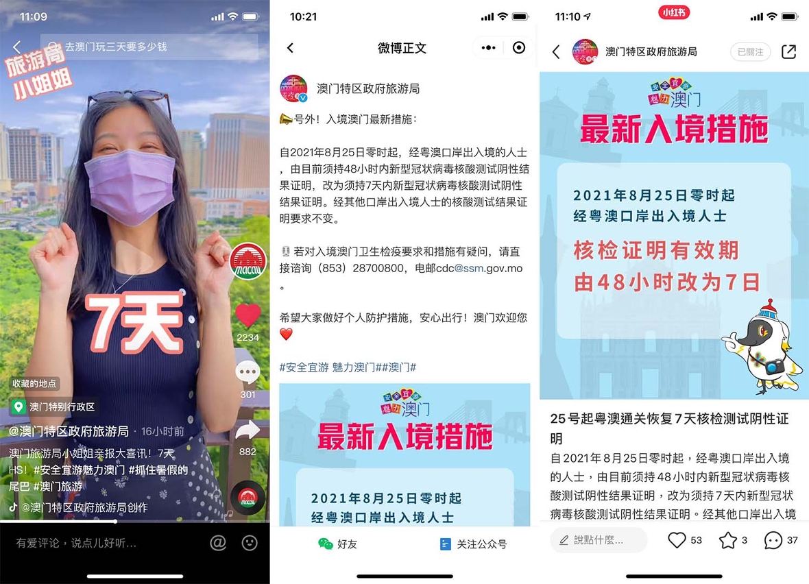 因應新型冠狀病毒感染應變協調中心於23日宣佈,8月25日零時起,經粵澳口岸出入境人士,改為須持7天內核酸測試陰性結果證明,旅遊局積極宣傳有關資訊,歡迎內地旅客來澳門旅遊。