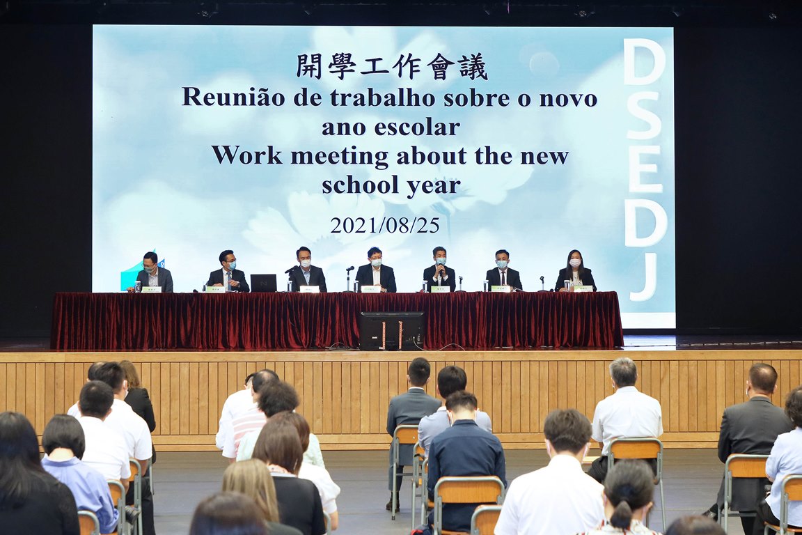 為加強與學校負責人交流2021/2022新學年的開課和關注事項,教育及青年發展局於2021年8月25日上午在教業中學舉行非高等教育學校開學工作會議。會議由教青局局長老柏生主持,副局長龔志明、丁少雄、阮佩賢和部門主管,以及所有學校領導和代表出席。會議並邀請仁伯爵綜合醫院醫務主任戴華浩就推動教育界疫苗接種工作進行講解和交流。