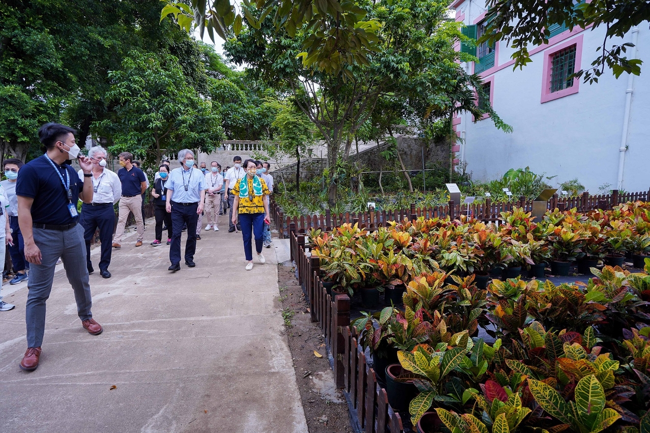 另外,諮詢委員亦到了過去只供內部使用,現經整理後對外開放的白鴿巢苗圃參觀,苗圃面積約四千五百平方米,分為上下兩層,上層分五個區域,包括觀花植物區、香花植物區、觀葉植物區、耐蔭植物區以及觀賞盆景區,約有八十種植物,共四千八百盆;市民除觀賞外,亦可使用手提電話掃瞄介紹牌上的二維碼,獲取介紹各種植物特性的資料。而為了保留當年白鴿巢苗圃曾引入栽種及收集保留外地植物的歷史意義,市民可於苗圃區內觀賞其中二十五種歷年來本澳從外地引種之樹種。
