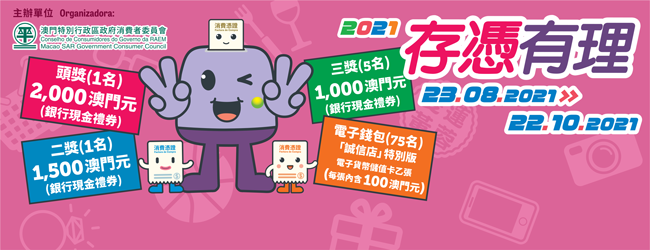 第二期「存憑有理 2021」有獎活動詳情及參加細則已上載至消委會網頁(www.consumer.gov.mo),提醒參加者須按參加辦法及細則準確填妥個人資料,並保留用於登記抽獎的消費憑證正本,作為辦理領獎手續之必需證明。
