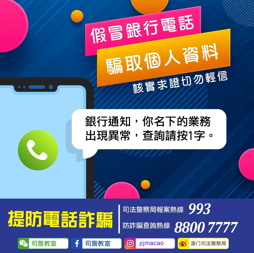 近日司法警察局接獲市民舉報,稱接到一通聲稱本澳某銀行的語音訊息來電,內容指事主名下的業務出現異常,著事主按“1”字查詢。事主覺得可疑立即掛線,並馬上向司警局舉報。及後,有關銀行已澄清並無以上述方式致電客戶,並提醒客戶警惕假冒該銀行的詐騙電話。