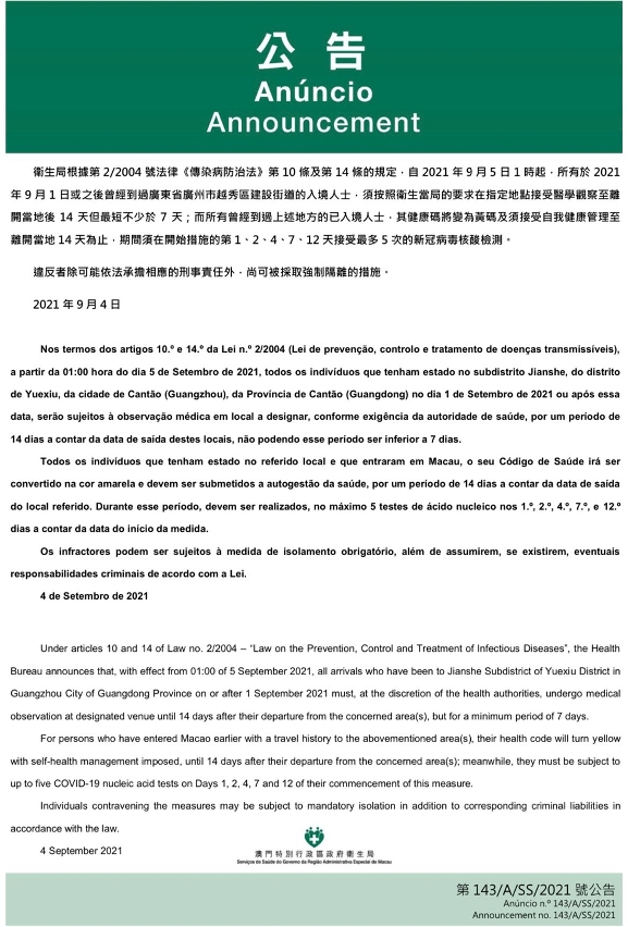 新型冠狀病毒感染應變協調中心宣佈,因應廣東省的疫情變化,衛生局根據第2/2004號法律《傳染病防治法》第10條和第14條的規定,自2021年9月5日1時起,所有於2021年9月1日或之後曾經到過廣東省廣州巿越秀區建設街道的入境人士,須按照衛生當局的要求在指定地點接受醫學觀察至離開當地後14天但最短不少於7天;而所有曾經到過上述地方的已入境人士,其健康碼將變為黃碼及須接受自我健康管理至離開當地 14 天為止,期間須在開始措施的第 1、2、4、7、12 天接受最多 5 次的新冠病毒核酸檢測。免費核酸檢測預約連結為https://app.ssm.gov.mo/mandatoryrnatestbook。核酸檢測結果不會上載至澳門健康碼亦不可作為出入境用途。如需將核酸檢測結果在澳門健康碼顯示,則須自費檢測。