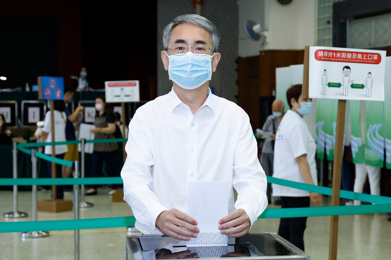 行政法務司司長張永春今(12)日上午到所屬的慈幼中學票站投票。他呼籲選民把握時間前往投票,盡公民義務行使投票權。