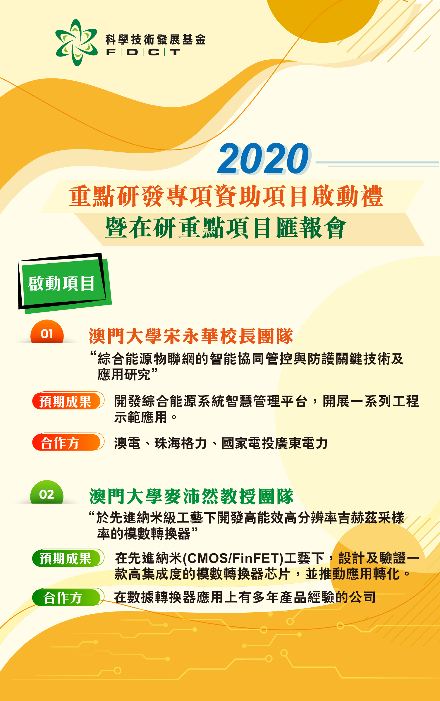 科學技術發展基金於2021年9月16日下午3時假澳門科學館會議廳舉行「2020年重點研發項目啟動禮暨在研重點項目匯報會」,邀請來自相關政府部門、本澳大專院校、科技企業及科技社團等代表出席,介紹剛獲資助重點研發項目的研究內容及在研項目的進展情況。活動內容包括4個新獲資助重點研發項目的啟動禮以及4個在研重點研發項目的階級性進展匯報會。