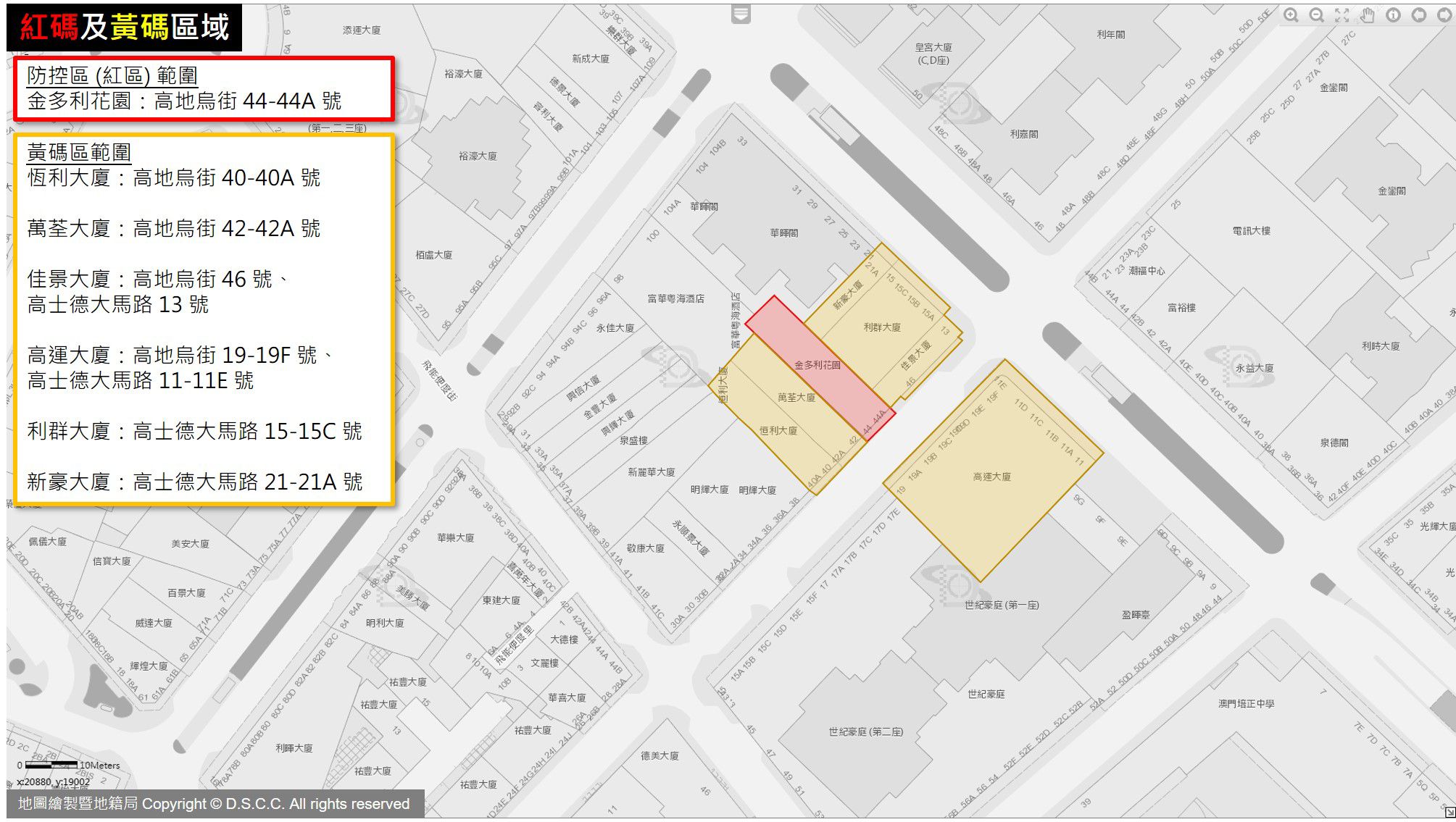 新增黃碼區範圍包括:高地烏街40-40A號恆利大廈,高地烏街42-42A號萬荃大廈,高地烏街46號、高士德大馬路13號佳景大廈,高地烏街19-19F號、高士德大馬路11-11E號高運大廈,高士德大馬路15-15C號利群大廈,高士德大馬路21-21A號新豪大廈。區內人士的健康碼將轉為黃碼,並於現場即時進行核酸檢測,首次核酸檢測24小時內完成,在完成首次核酸檢測前,不准外出;其他限制措施包括實施離境限制,並需進行最少14天的每日一檢、密切健康監測及自我健康管理。