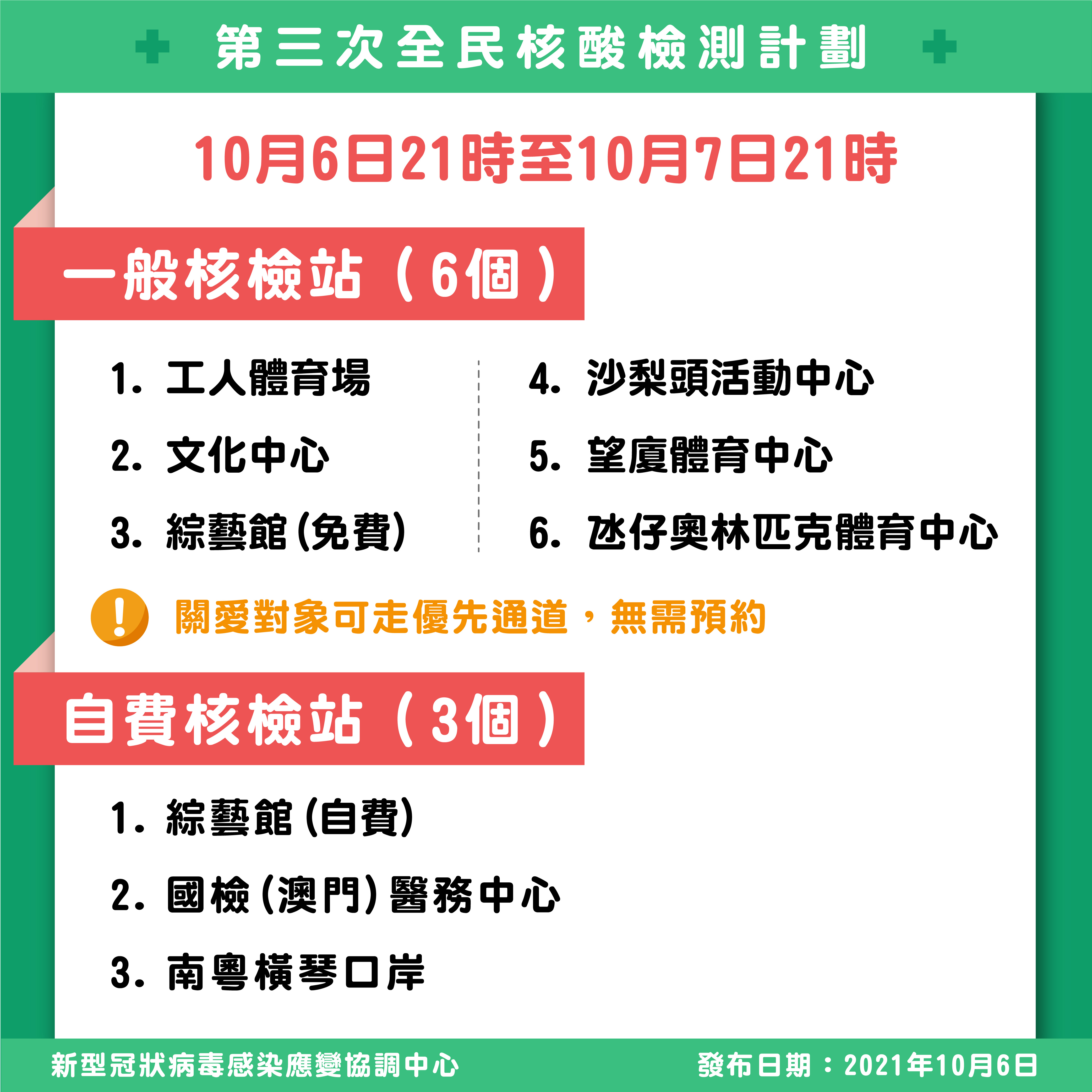 今晚9時起仍繼續運作的核檢站包括6個一般站,分別為工人體育場、澳門文化中心、綜藝館(免費)、沙梨頭活動中心、望廈體育中心1樓、奧林匹克體育中心-運動場-室內體育館,以及3個自費站,分別為綜藝館(自費)、國檢(澳門)醫務中心、南粵橫琴口岸。全部9個站點均24小時開放。一般站設置優先通道,關愛對象無須預約,可直接入站進行核檢。凡輪候時間少於15分鐘的一般站,可免預約入場進行檢測。請市民出門前留意各站點的實時輪候數據,並帶備身份證明文件及健康碼截圖。