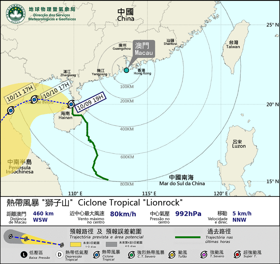 八號東南風球仍然生效。於晚上8時,熱帶風暴「獅子山」集結在本澳西南偏西約470 公里,將進入北部灣。但由於「獅子山」與東北季風共伴效應造成的強雨區仍持續影響珠江口,本澳風力間中仍達7至8級。8號東南風球仍繼續維持。預料今晚至明日初時本澳天氣仍然不穩定,間中有大驟雨及雷暴。