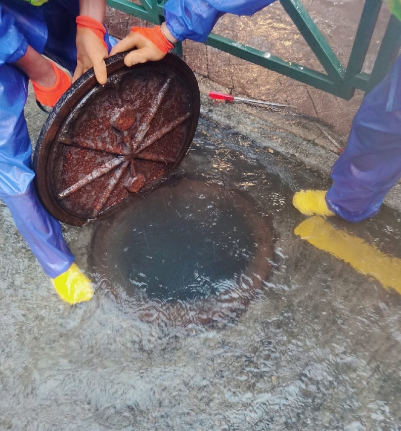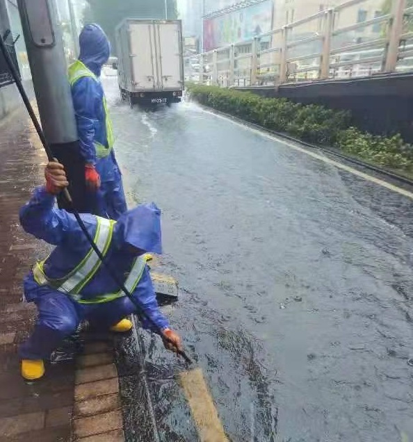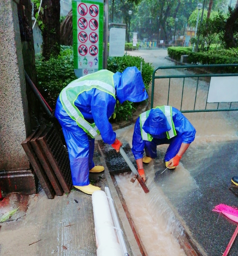 市政署啟動暴雨緊急應變小組機制,派員到各水浸黑點清理路邊雨水井沖積的垃圾,並在安全情況下打開渠蓋,加快下水道排洪能力。