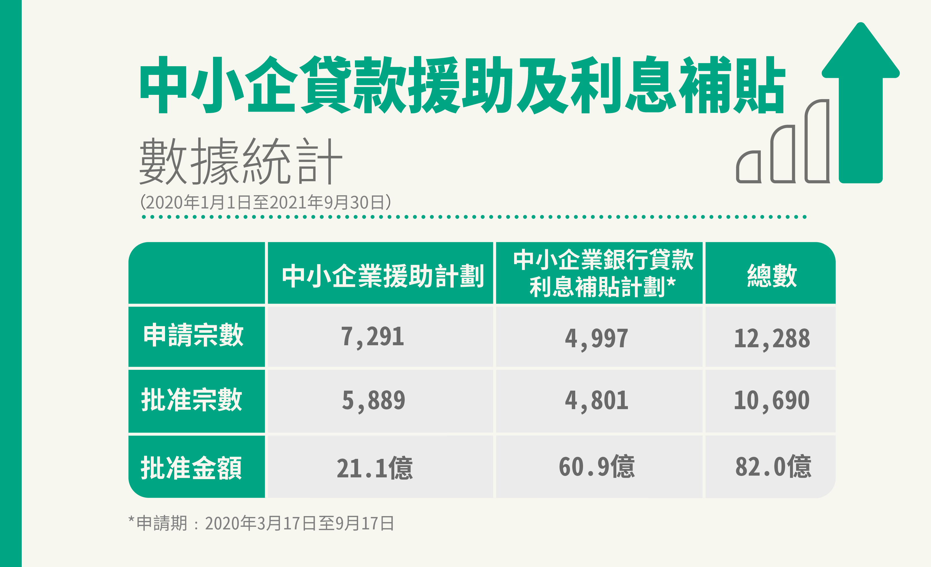 因應新冠肺炎疫情對經濟的影響,經科局去年至今一直推進各項扶助中小企業的工作,全力以赴加快申請審批,協助中小企取得流動和營運資金,解燃眉之急。由去年至2021年9月30日, “中小企業援助計劃”以及“中小企業銀行貸款利息補貼計劃” 合共接收了逾一萬二千宗申請,當中近八成七個案獲批,為中小企提供近82億元的流動資金(包括21.1億的政府貸款及60.9億的銀行貸款)。