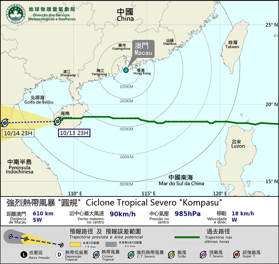 「圓規」正橫過海南島並將進入北部灣。受「圓規」相關環流影響,13日晚間及14日初時仍會有驟雨及雷暴,間中會有6至7級強風及有陣風。